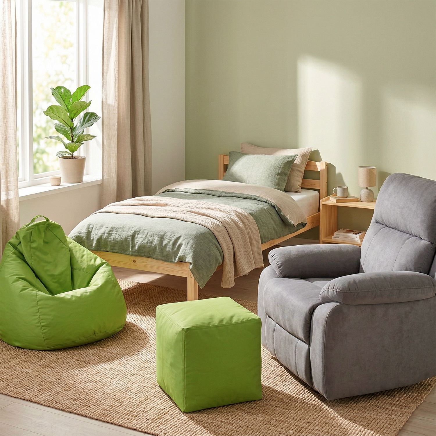 sedací vak ve tvaru kostky potah nylon, barevné provedení světle zelená plněný kuličkami z polystyrolu, obsah náplně 100 l zipový uzávěr, náplň možno doplňovat nebo odebírat cena včetně náplně