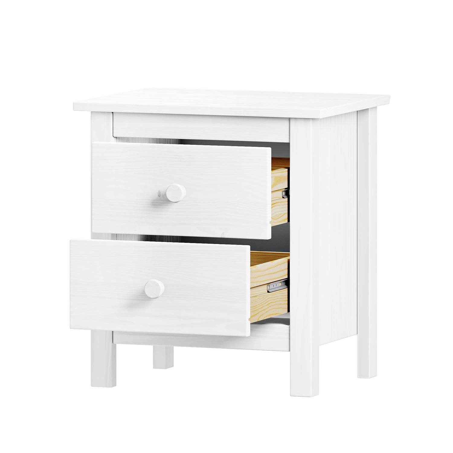 materiál masiv borovice, barevné provedení bílý lak 2 zásuvky s kovovými pojezdy