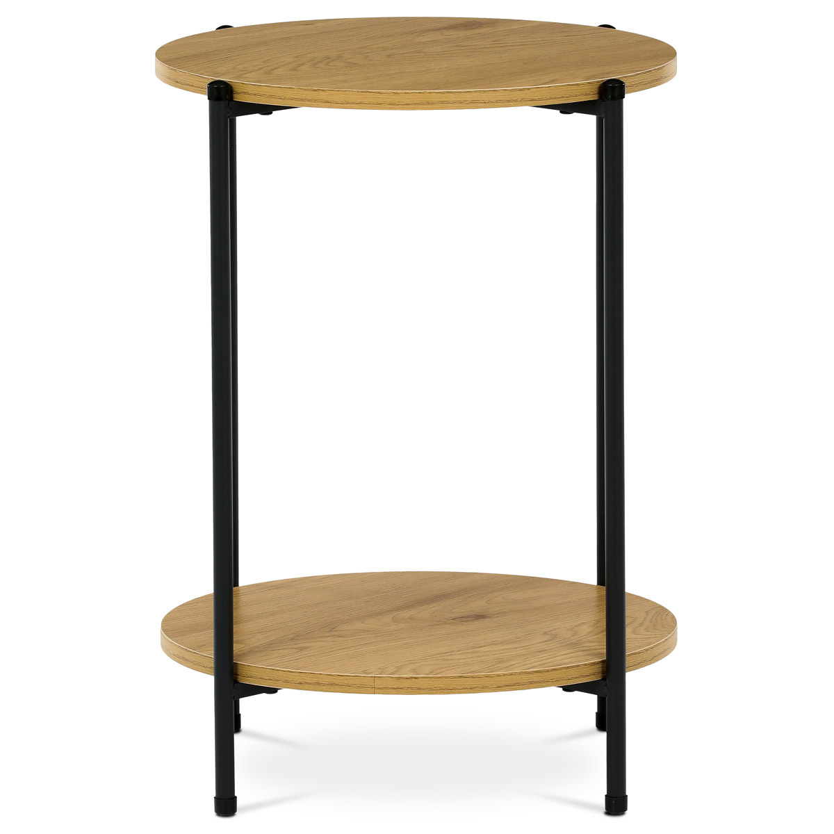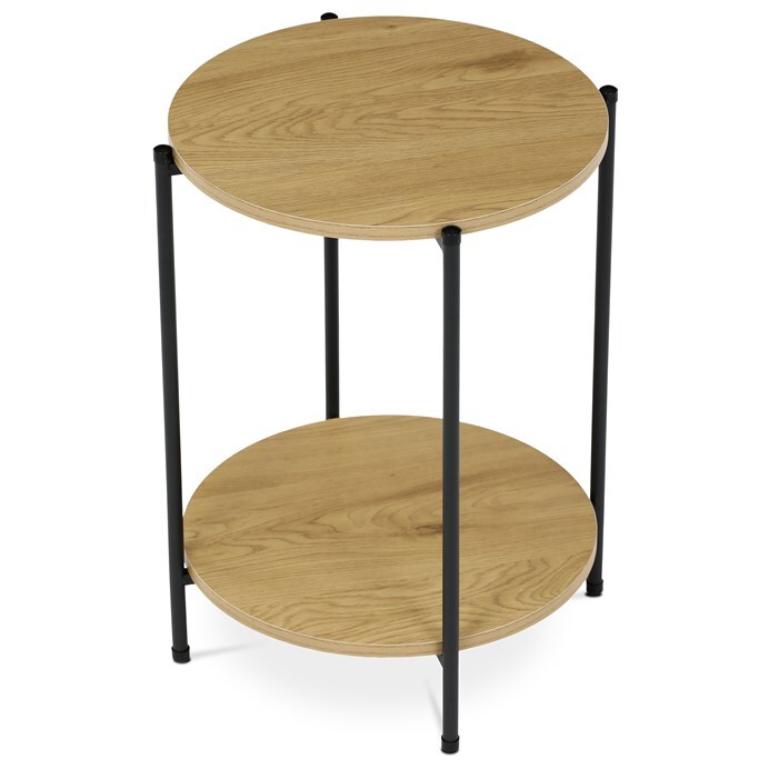 Moderní přístavný stolek značky Autronic spojuje minimalistický design a funkčnost. Kulaté desky v dekoru divokého dubu dodávají stolku přírodní eleganci, zatímco černě lakovaný kovový rám zajišťuje stabilitu a odolnost. Dvě praktické police nabízí dostatek prostoru pro uložení dekorací, knih nebo šálku kávy. Díky svému univerzálnímu vzhledu je tento stolek ideální volbou do obývacího pokoje, ložnice nebo kanceláře. Vneste do svého interiéru styl a praktičnost s tímto nadčasovým kouskem!