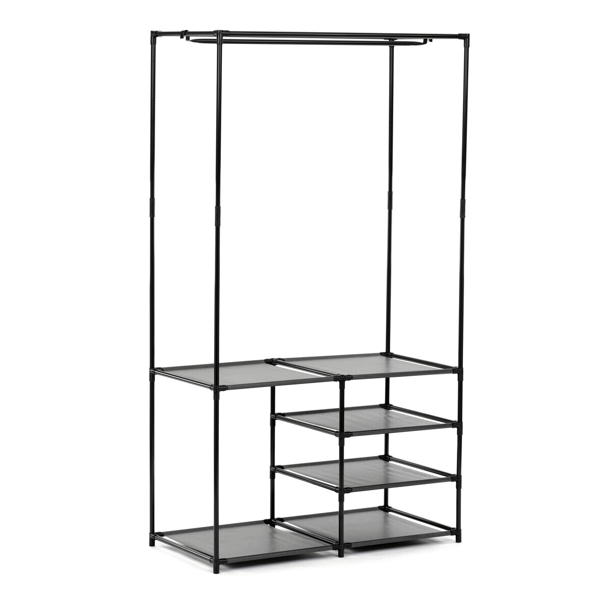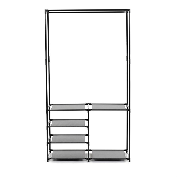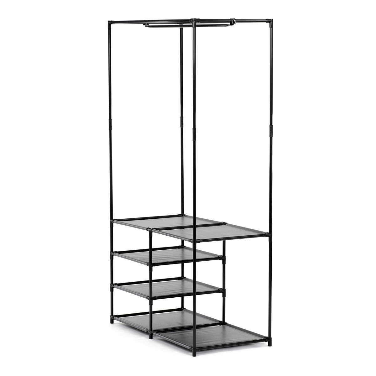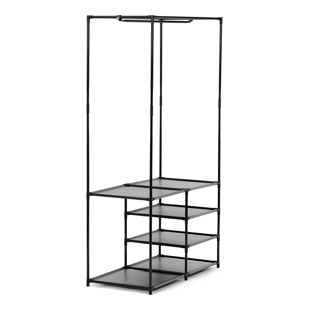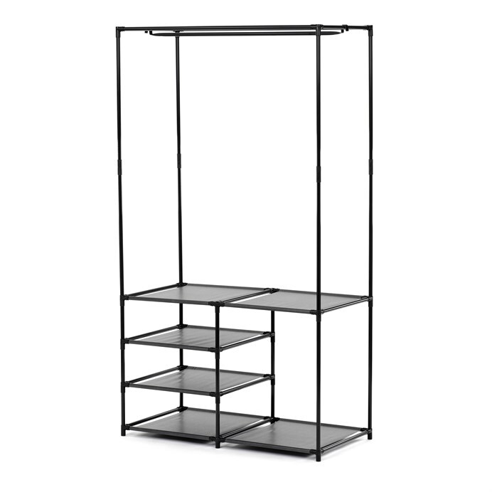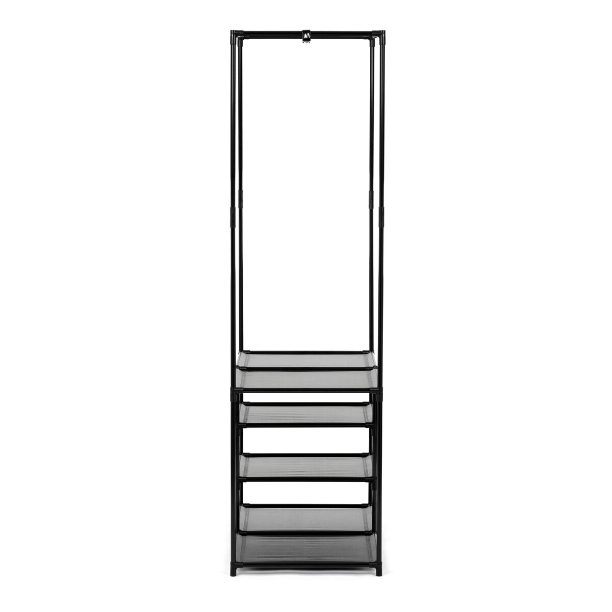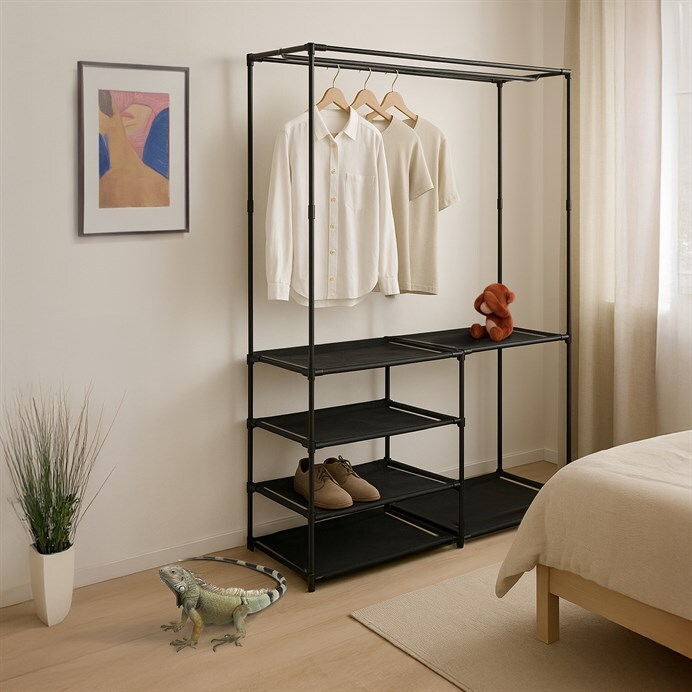 Moderní stojan na šaty značky Autronic spojuje praktičnost s elegantním designem. Stabilní černá kovová konstrukce nabízí nejen prostor pro zavěšení oděvů, ale také čtyři police pro uložení krabic, bot nebo doplňků. Díky otevřenému provedení je vše snadno přístupné a přehledné, což z něj činí ideální doplněk do šatny, ložnice nebo předsíně. Minimalistický styl snadno zapadne do různých typů interiérů a pomáhá vytvořit praktické a organizované prostředí. Skvělá volba pro každodenní použití.