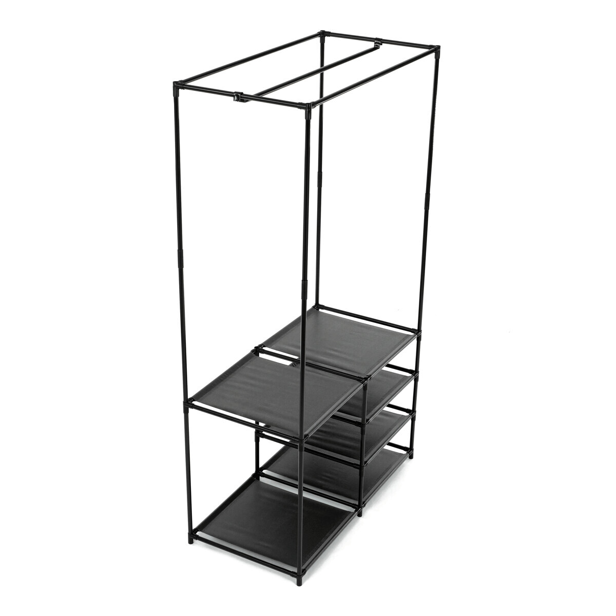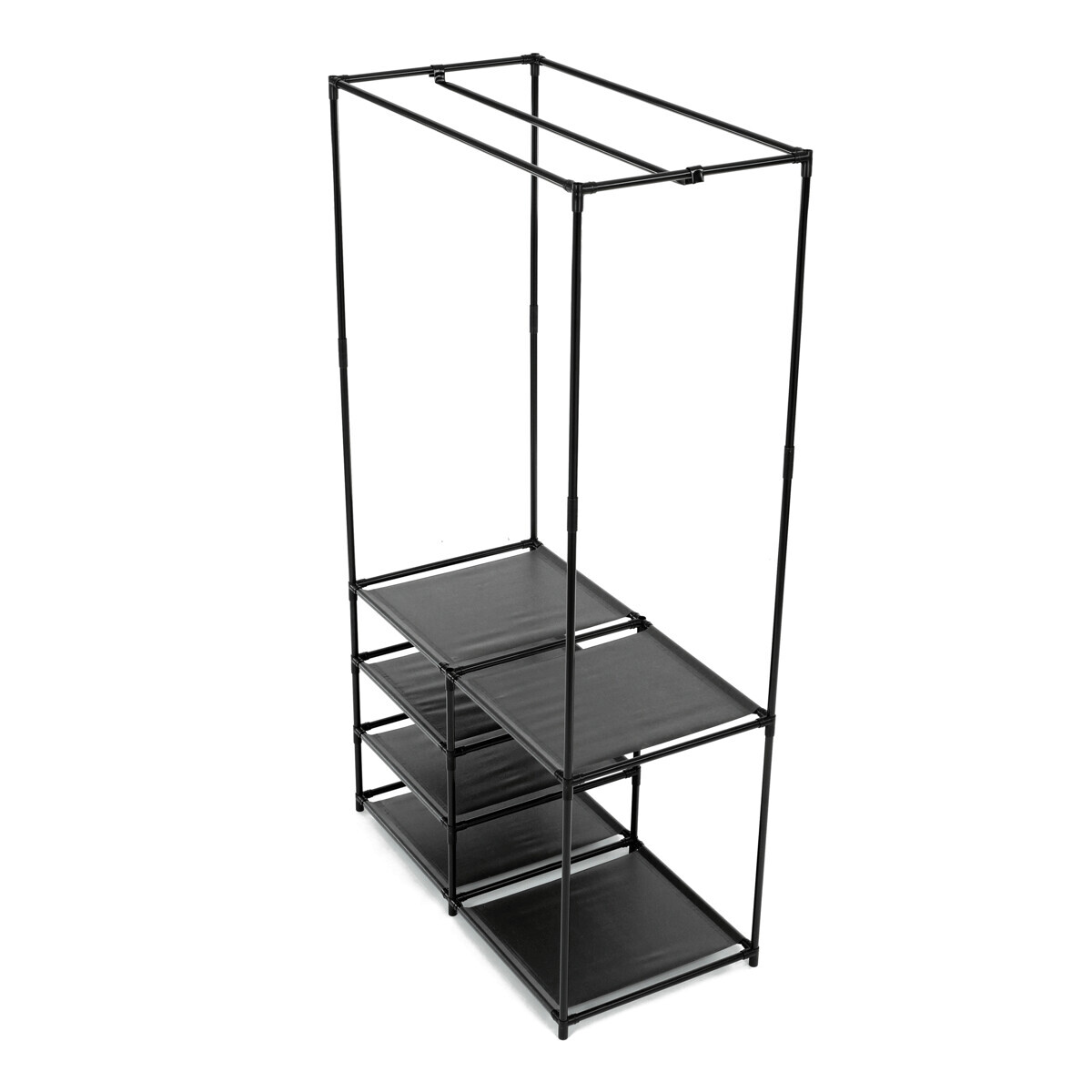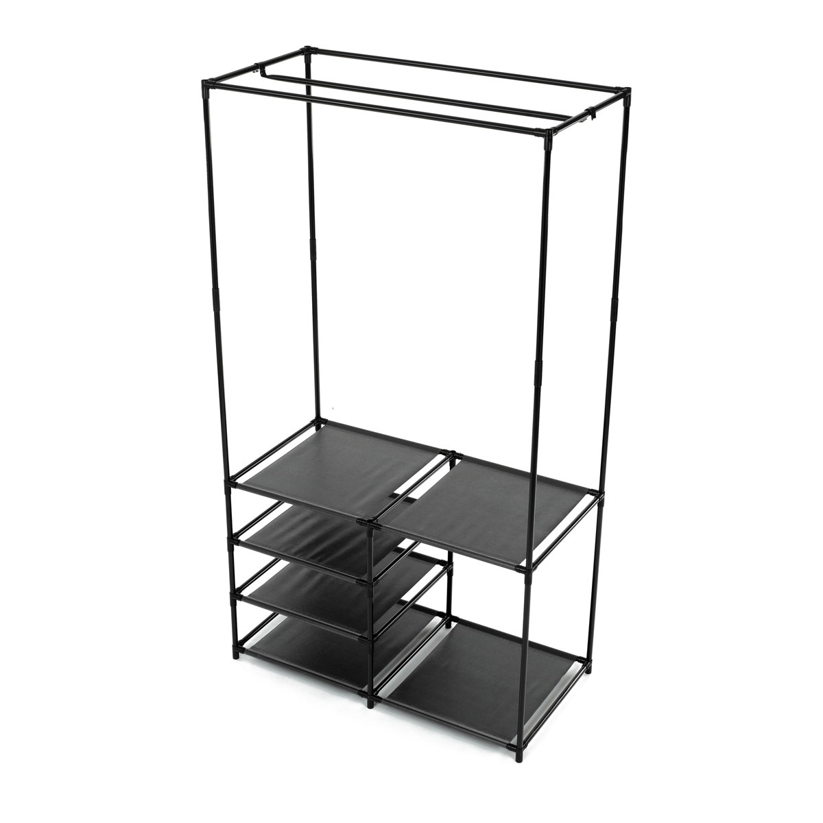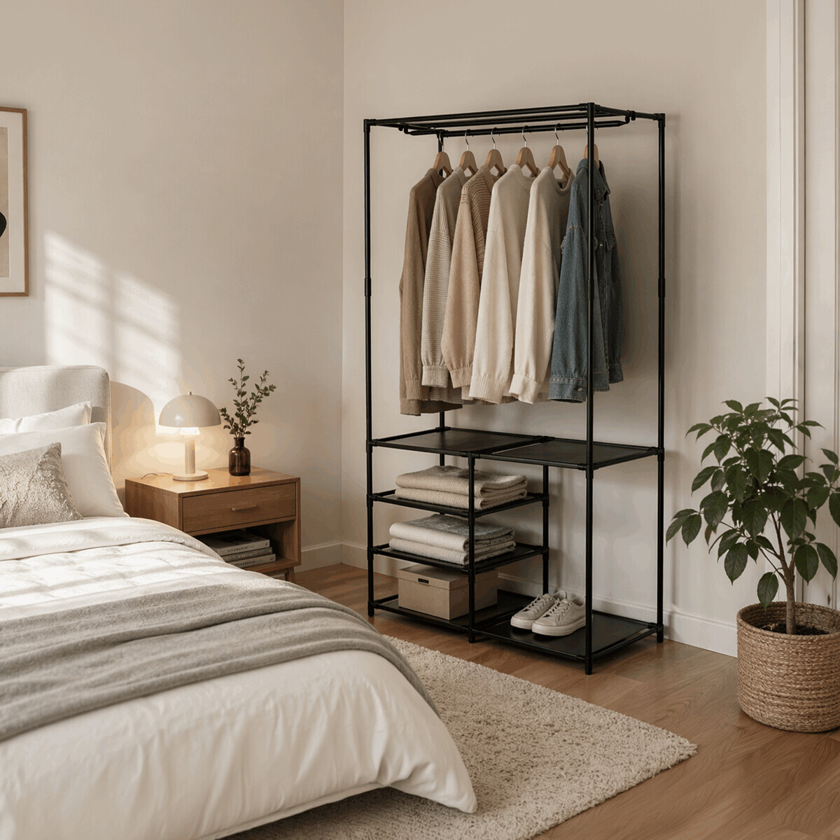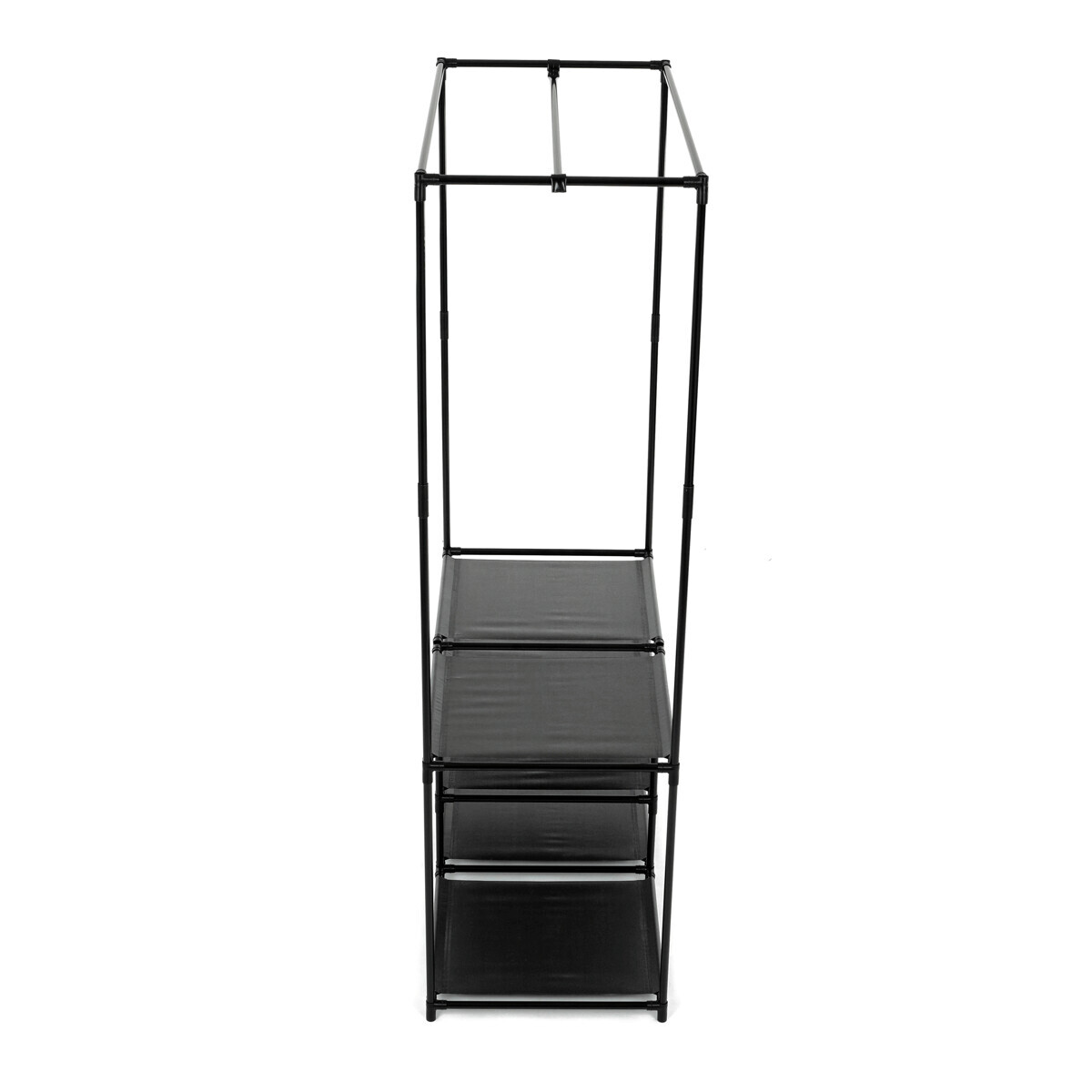 Moderní stojan na šaty značky Autronic spojuje praktičnost s elegantním designem. Stabilní černá kovová konstrukce nabízí nejen prostor pro zavěšení oděvů, ale také čtyři police pro uložení krabic, bot nebo doplňků. Díky otevřenému provedení je vše snadno přístupné a přehledné, což z něj činí ideální doplněk do šatny, ložnice nebo předsíně. Minimalistický styl snadno zapadne do různých typů interiérů a pomáhá vytvořit praktické a organizované prostředí. Skvělá volba pro každodenní použití.