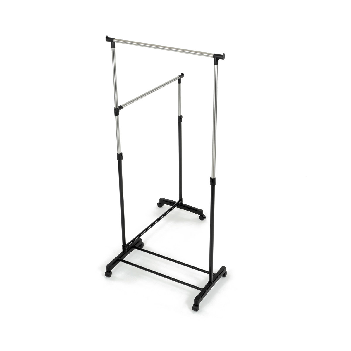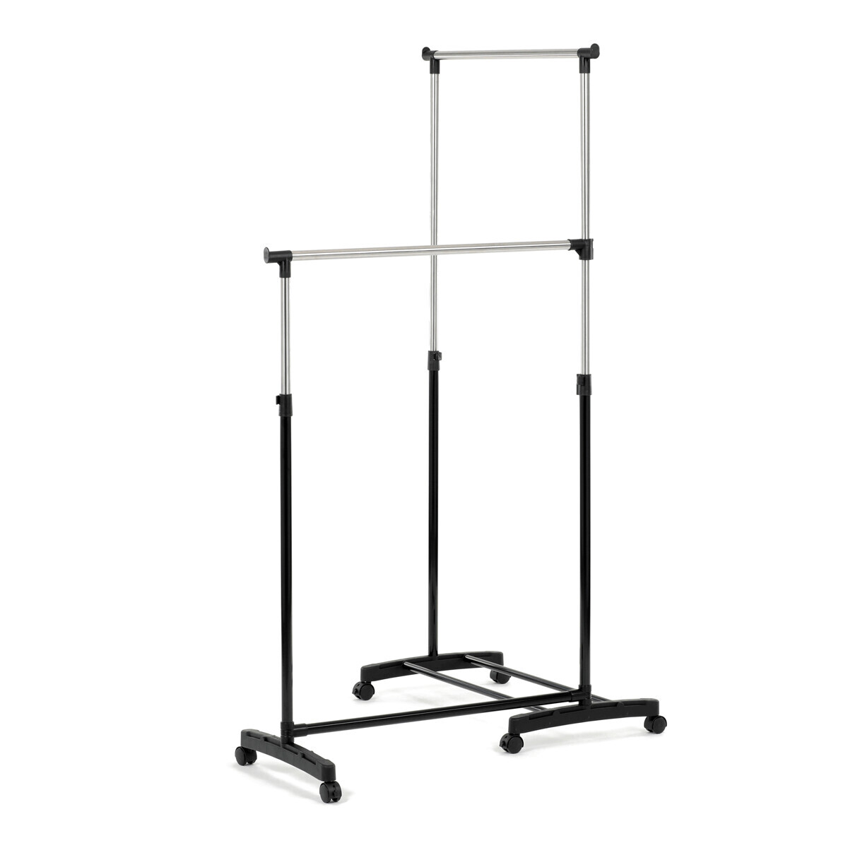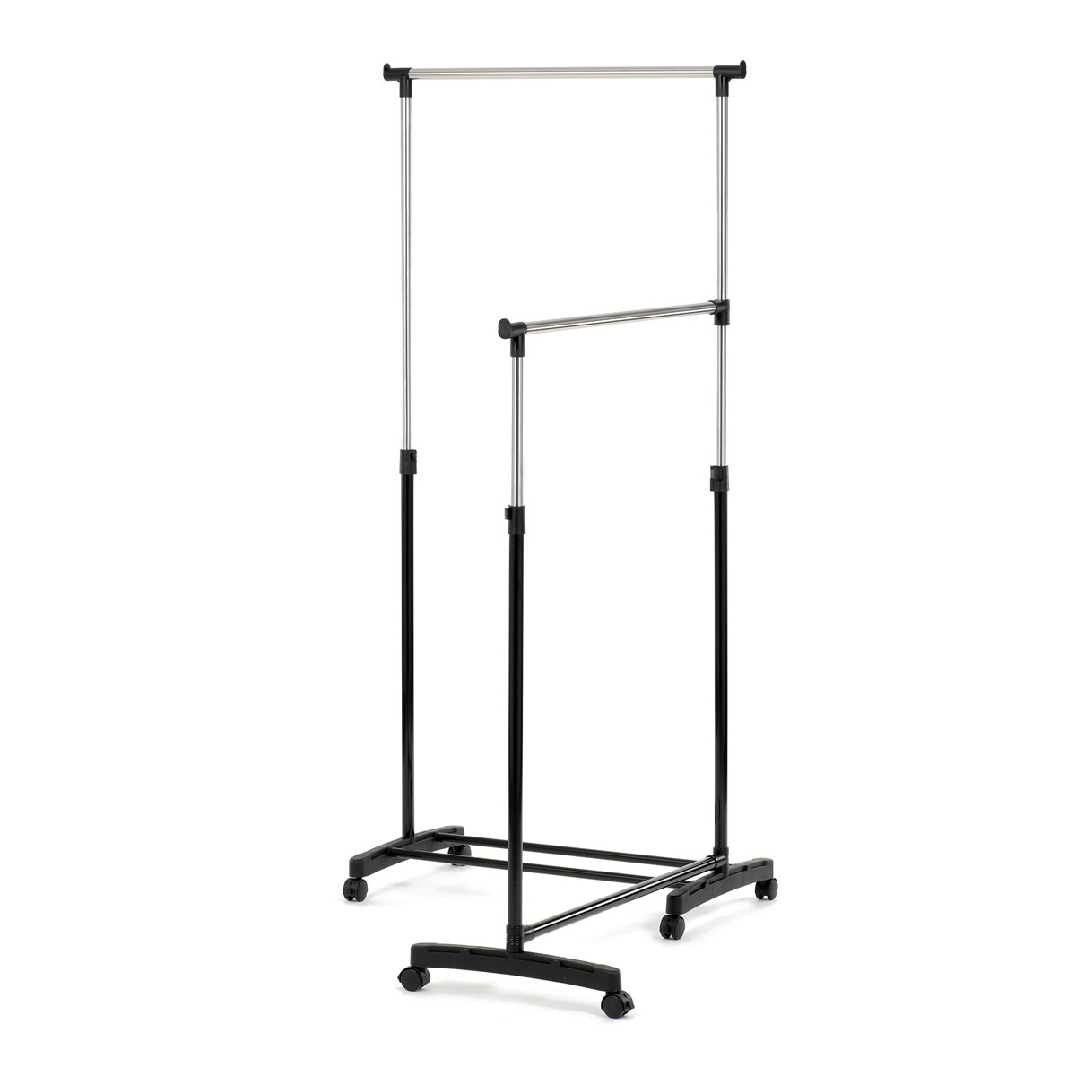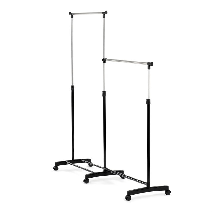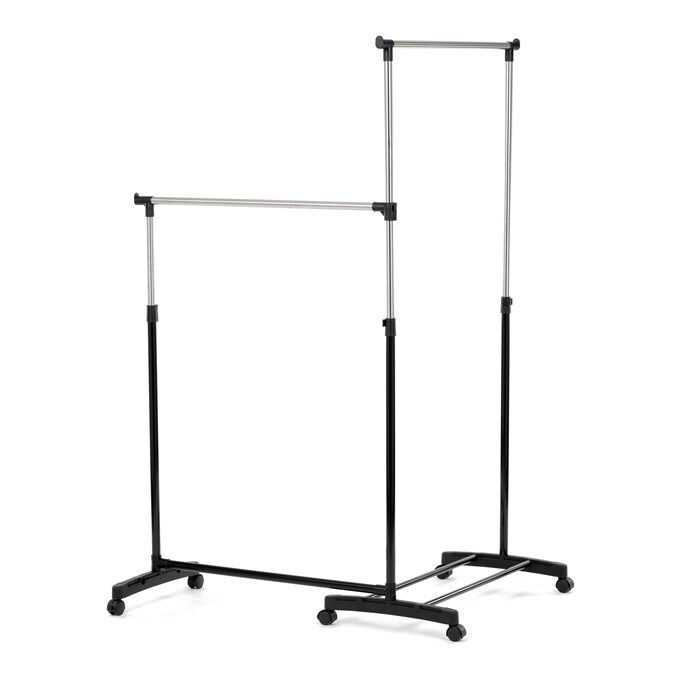 Dvojitý stojan na šaty značky Autronic je ideálním řešením pro maximální využití úložného prostoru. Stabilní kovová konstrukce v kombinaci s kolečky umožňuje snadnou manipulaci a vysokou nosnost. Dvě prostorné tyče poskytují dostatek místa pro zavěšení oblečení, ideální pro šatny, ložnice či předsíně. Minimalistický design v černém provedení se snadno přizpůsobí jakémukoliv interiéru. Díky své praktičnosti a flexibilitě je tento stojan perfektní volbou pro každodenní použití i sezónní organizaci šatníku.
