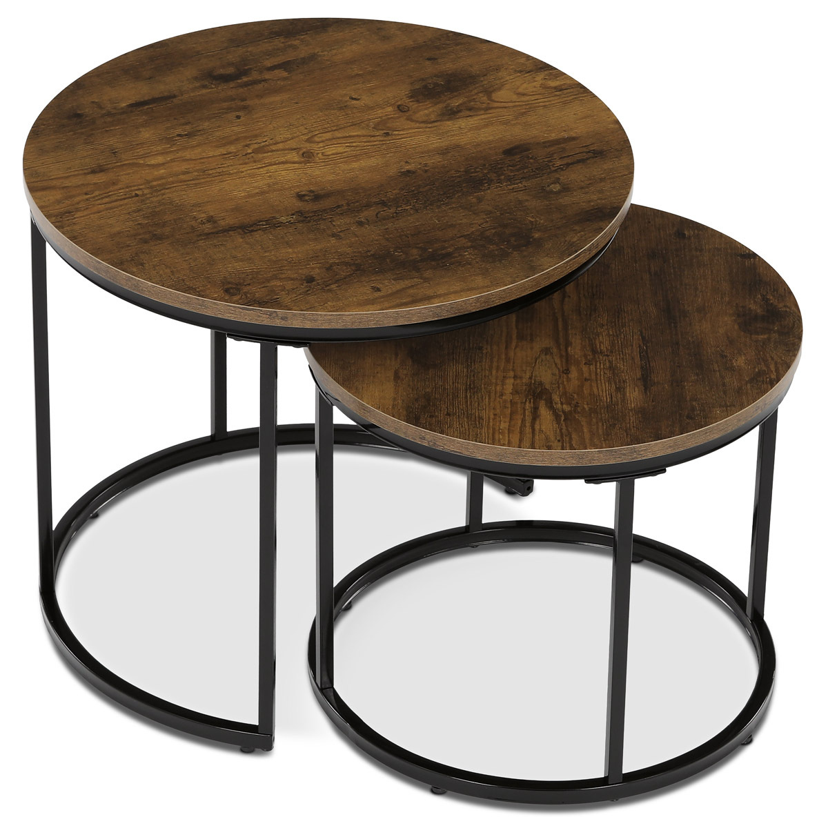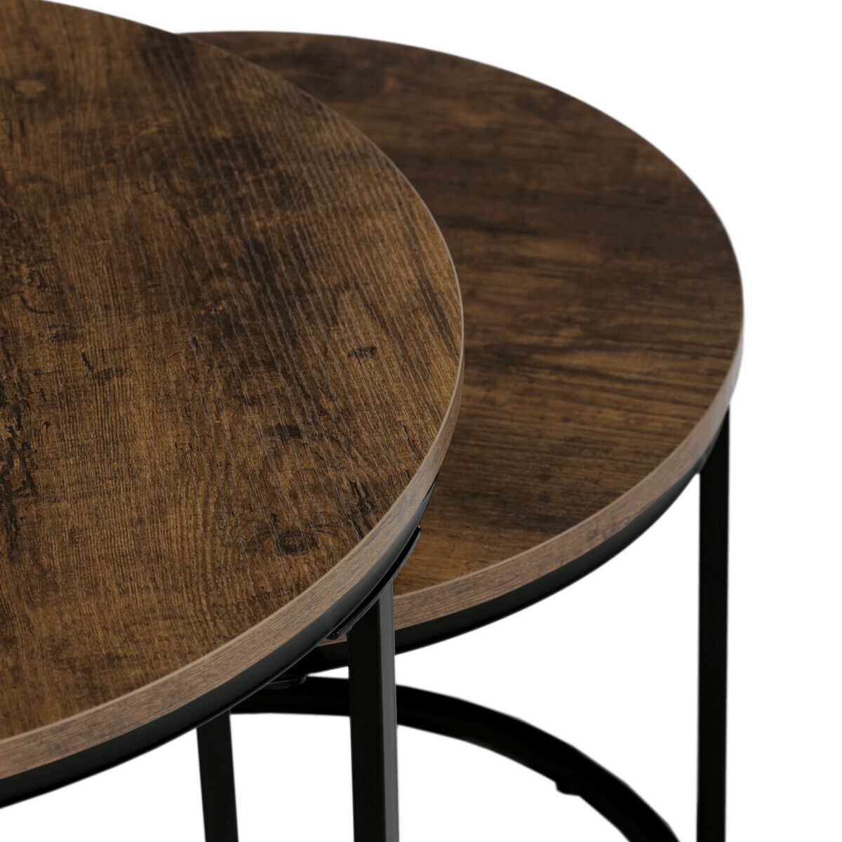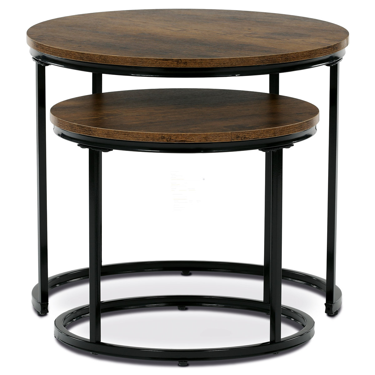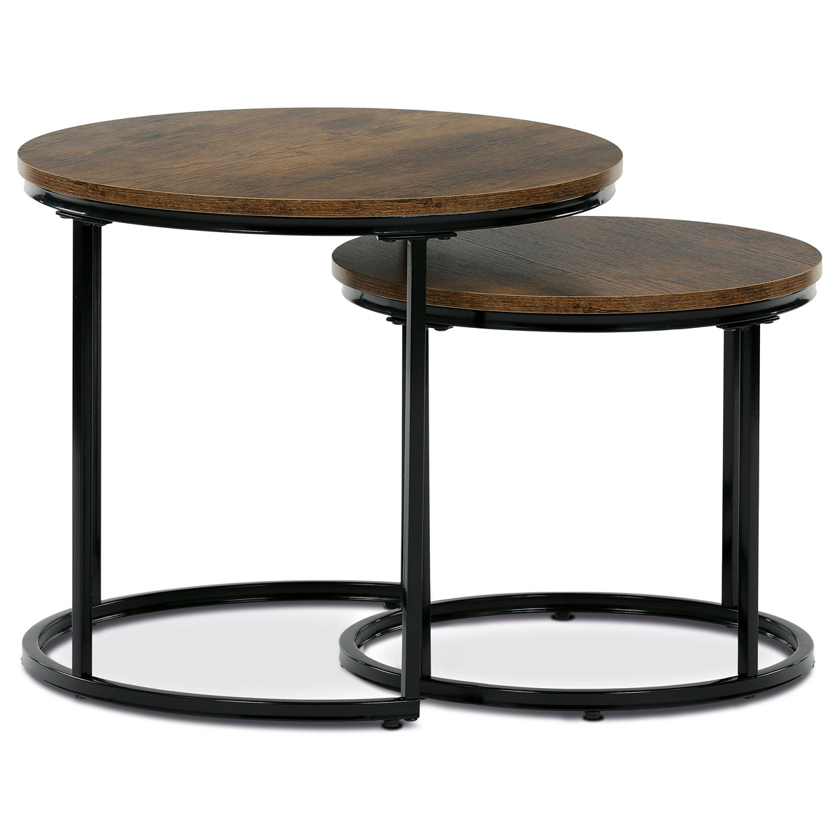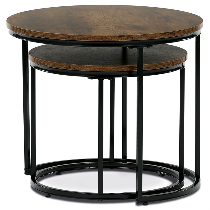 Sada dvou odkládacích stolků značky Autronic spojuje moderní design a funkčnost. Kulaté desky v přírodním dekoru skvěle kontrastují s černými kovovými nohami, což vytváří elegantní industriální vzhled. Stoly lze snadno zasunout pod sebe, což šetří prostor a zvyšuje jejich praktické využití. Jsou ideální do obývacího pokoje k odložení nápojů, knih nebo dekorací. Díky pečlivému zpracování a kvalitním materiálům je tato sada stylovým a odolným doplňkem každého interiéru. Menší stolek je o průměru 43cm a výšce 37cm.