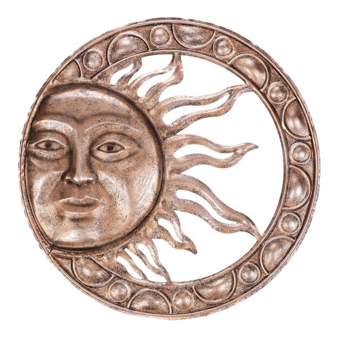 Tato jedinečná dekorace v kombinaci měděných a stříbrných tónů přináší motiv slunce s obličejem, umístěného na boku kruhu. Elegantní spojení barev a asymetrický design dodají vašemu prostoru originální a příjemnou atmosféru. Skvělý doplněk pro interiéry i venkovní zdi.