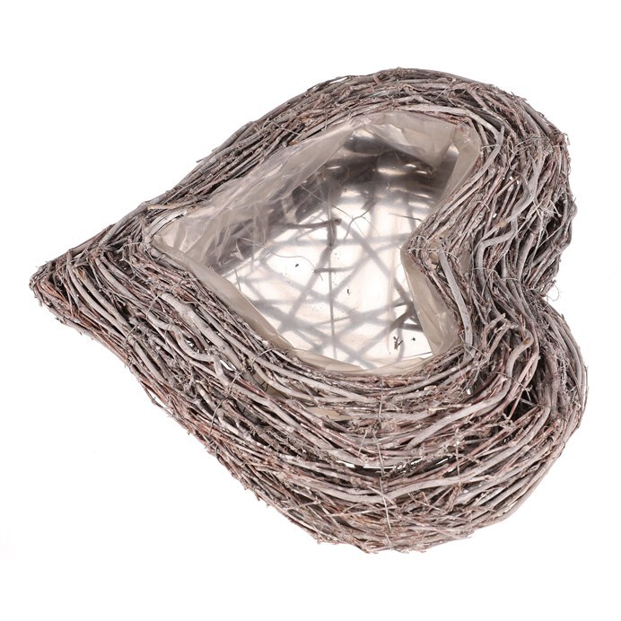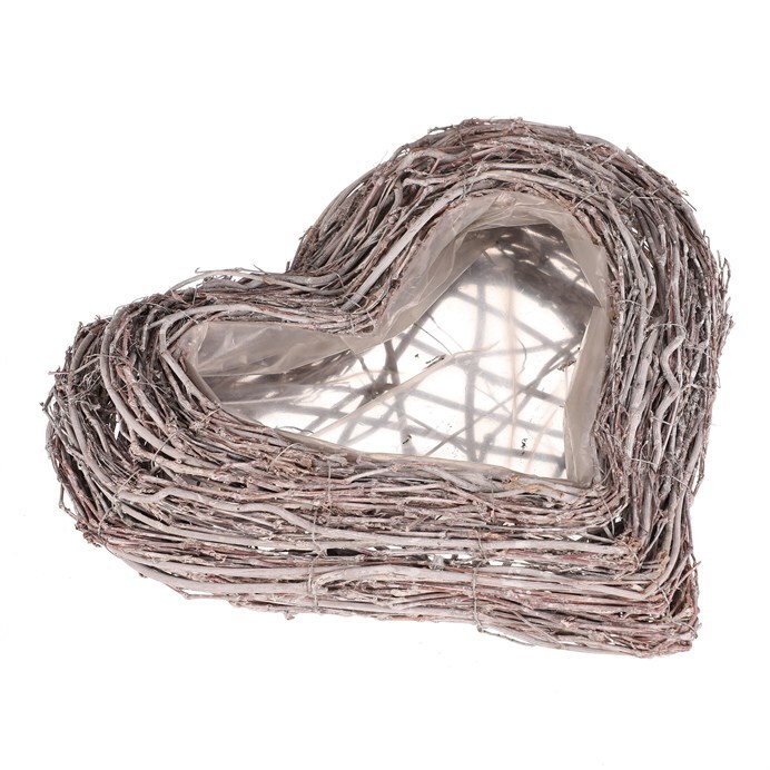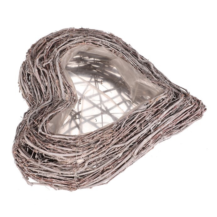 Pietní obal na květiny z šedého proutí ve tvaru srdce je decentní a vkusnou volbou pro výzdobu vzpomínkových míst. Obal je vyplněn igelitovou vložkou, která má ochrannou funkci pro rostliny v něm zasazené, a zároveň chrání i své okolí.