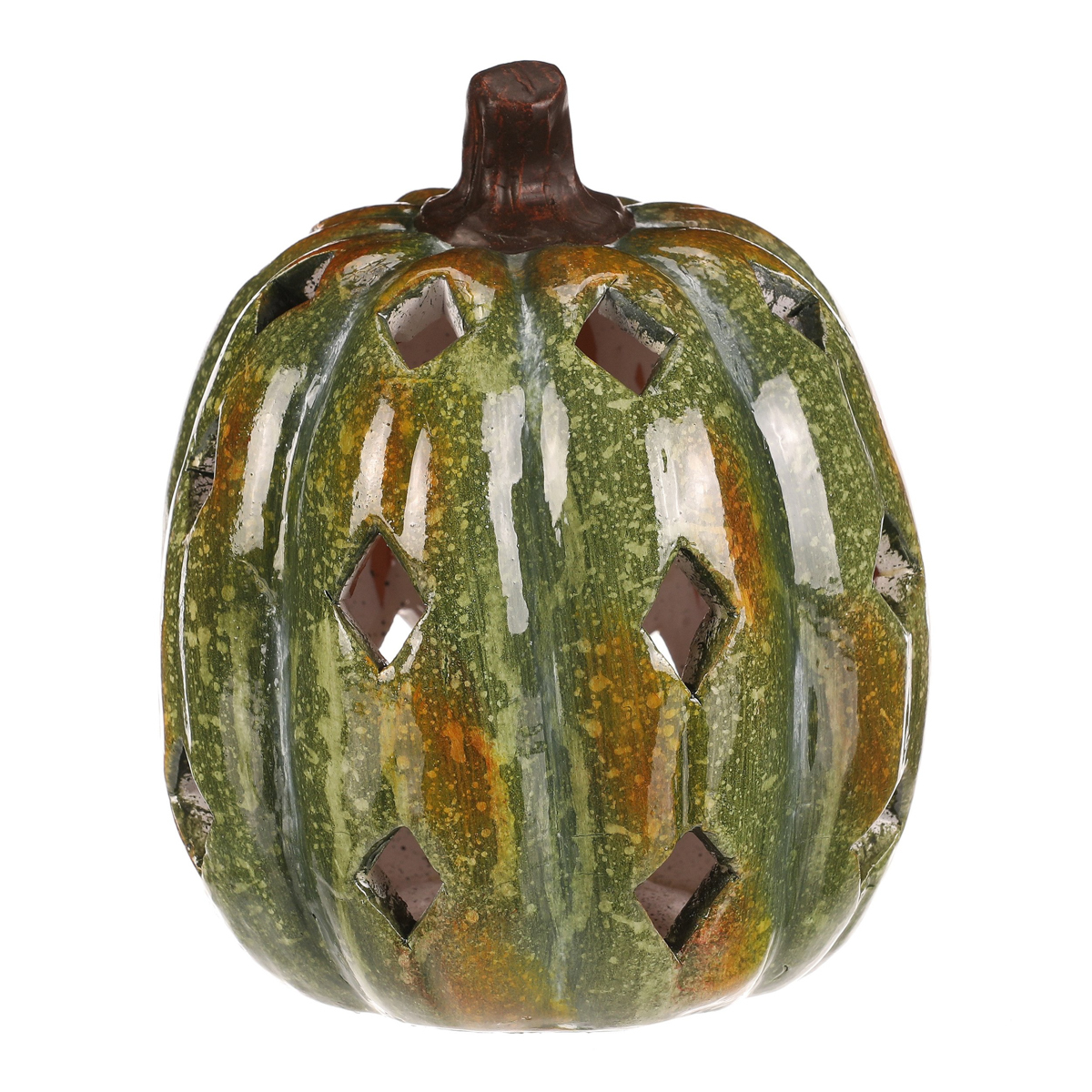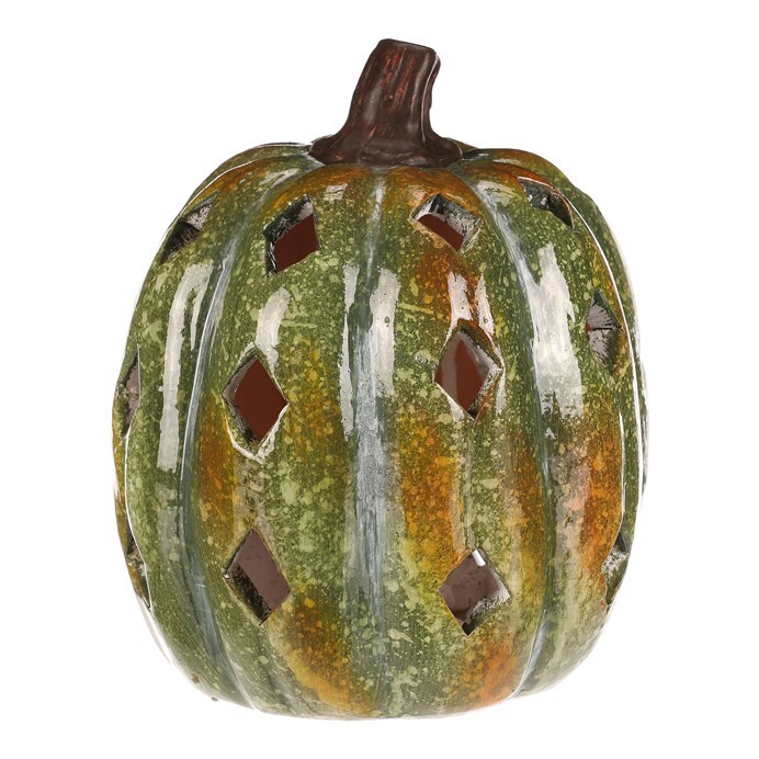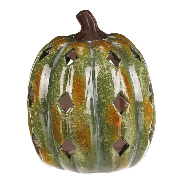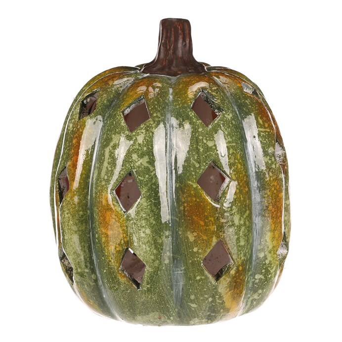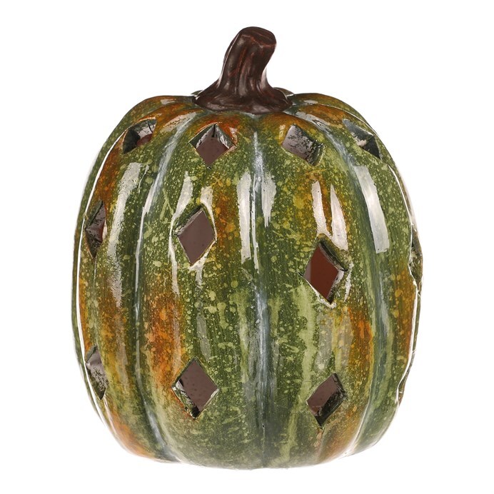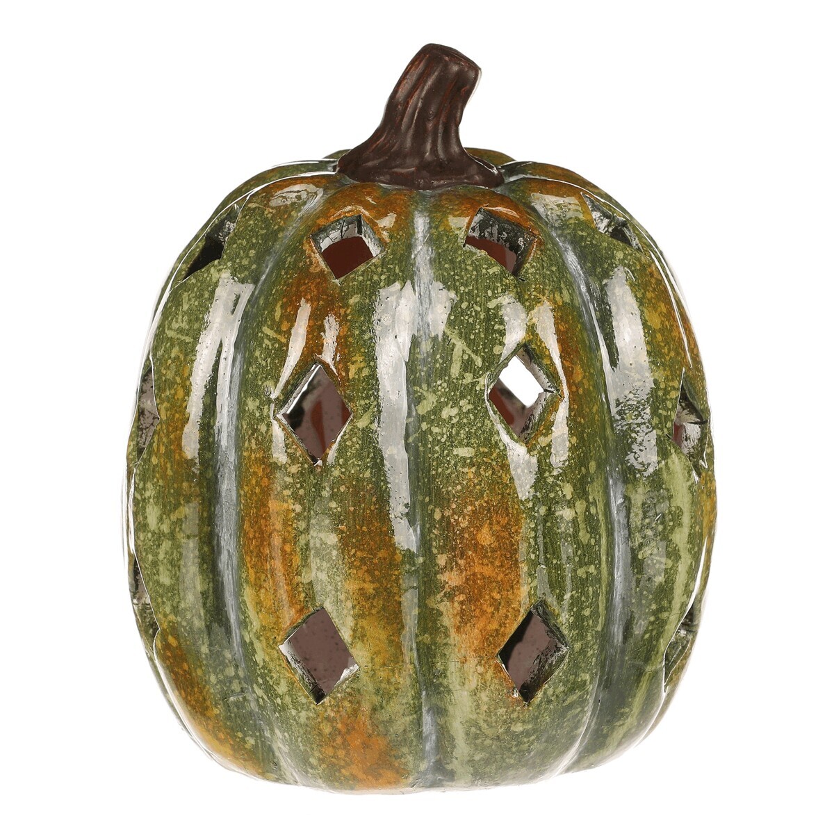 Zelená dýně z keramiky s lesklým povrchem a prostorem, ve kterém je umístěné LED osvětlení, navodí tu pravou podzimní atmosféru. Po obvodu se nachází hranaté otvory v prizích, kterými budou po rozsvícení umělé svíce efektně procházet paprsky světla.