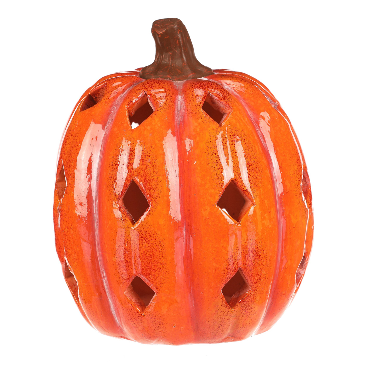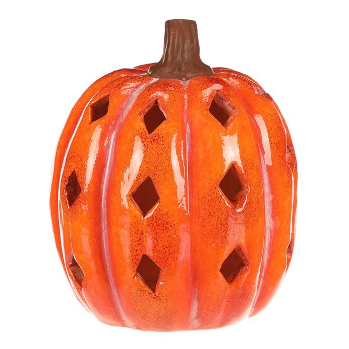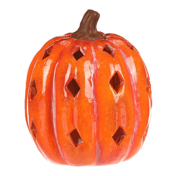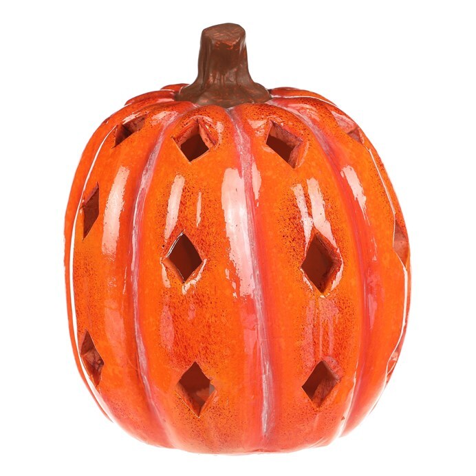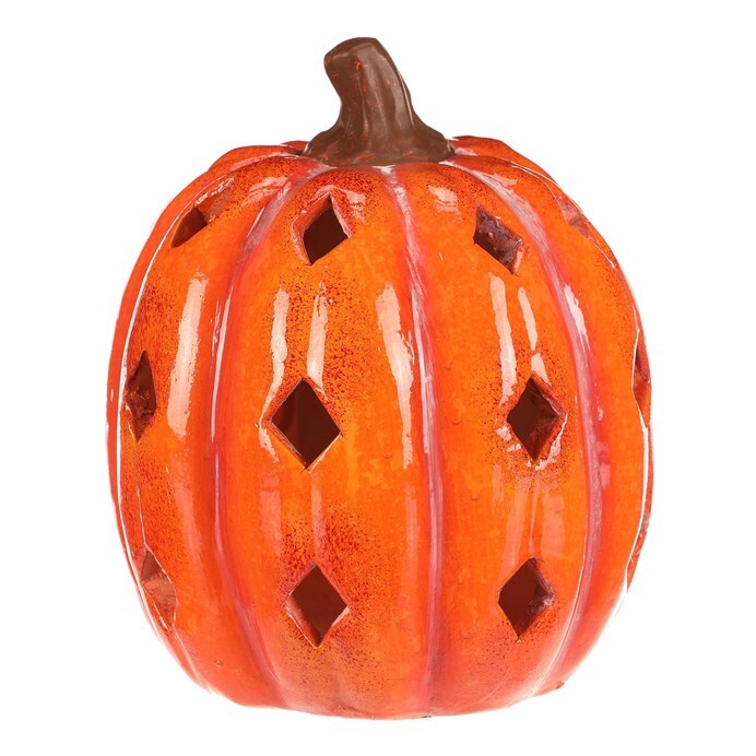 Oranžová dýně z keramiky s lesklým povrchem a prostorem, ve kterém je umístěné LED osvětlení, navodí tu pravou podzimní atmosféru. Po obvodu se nachází hranaté otvory v prizích, kterými budou po rozsvícení umělé svíce efektně procházet paprsky světla.