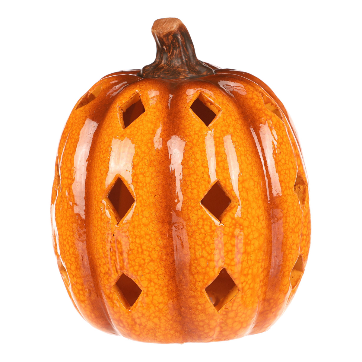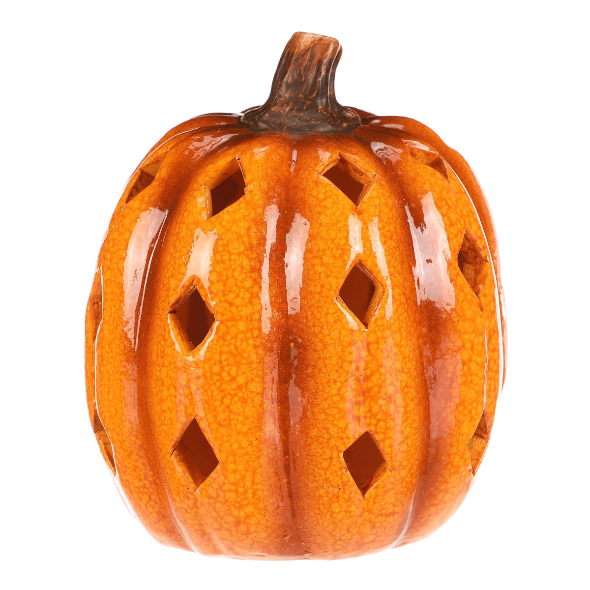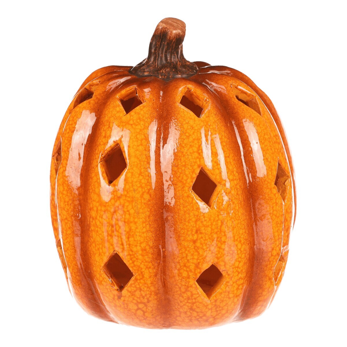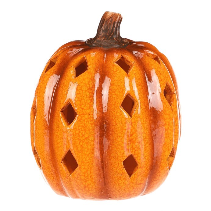 Žluto-oranžová dýně z keramiky s lesklým povrchem a prostorem, ve kterém je umístěné LED osvětlení, navodí tu pravou podzimní atmosféru. Po obvodu se nachází hranaté otvory v prizích, kterými budou po rozsvícení umělé svíce efektně procházet paprsky světla.