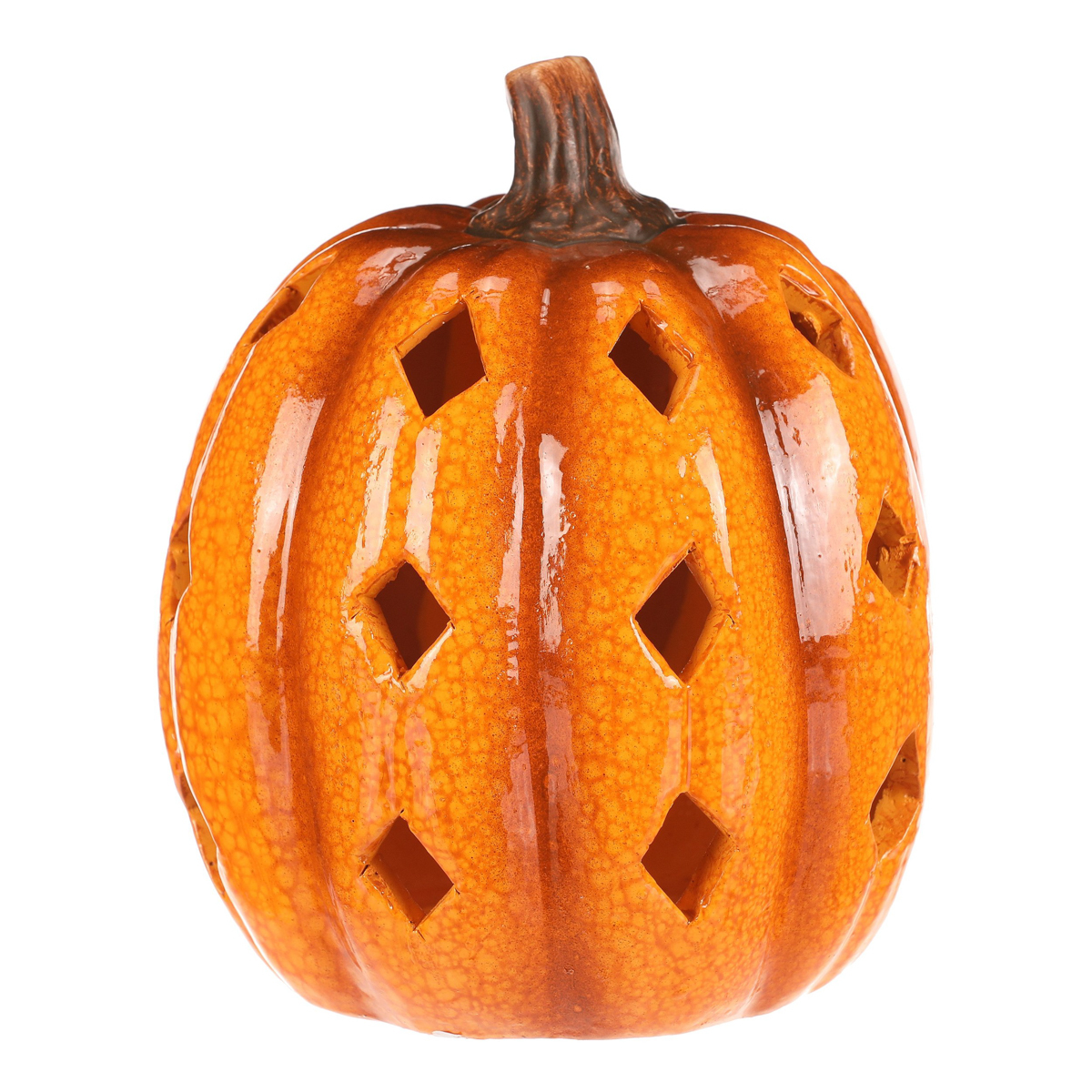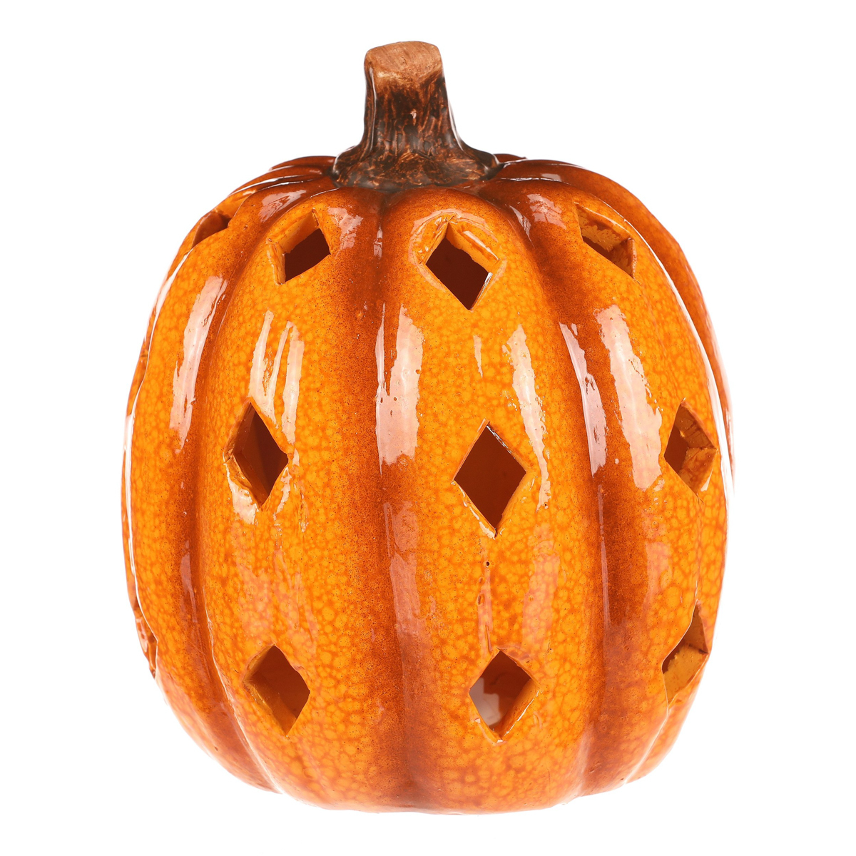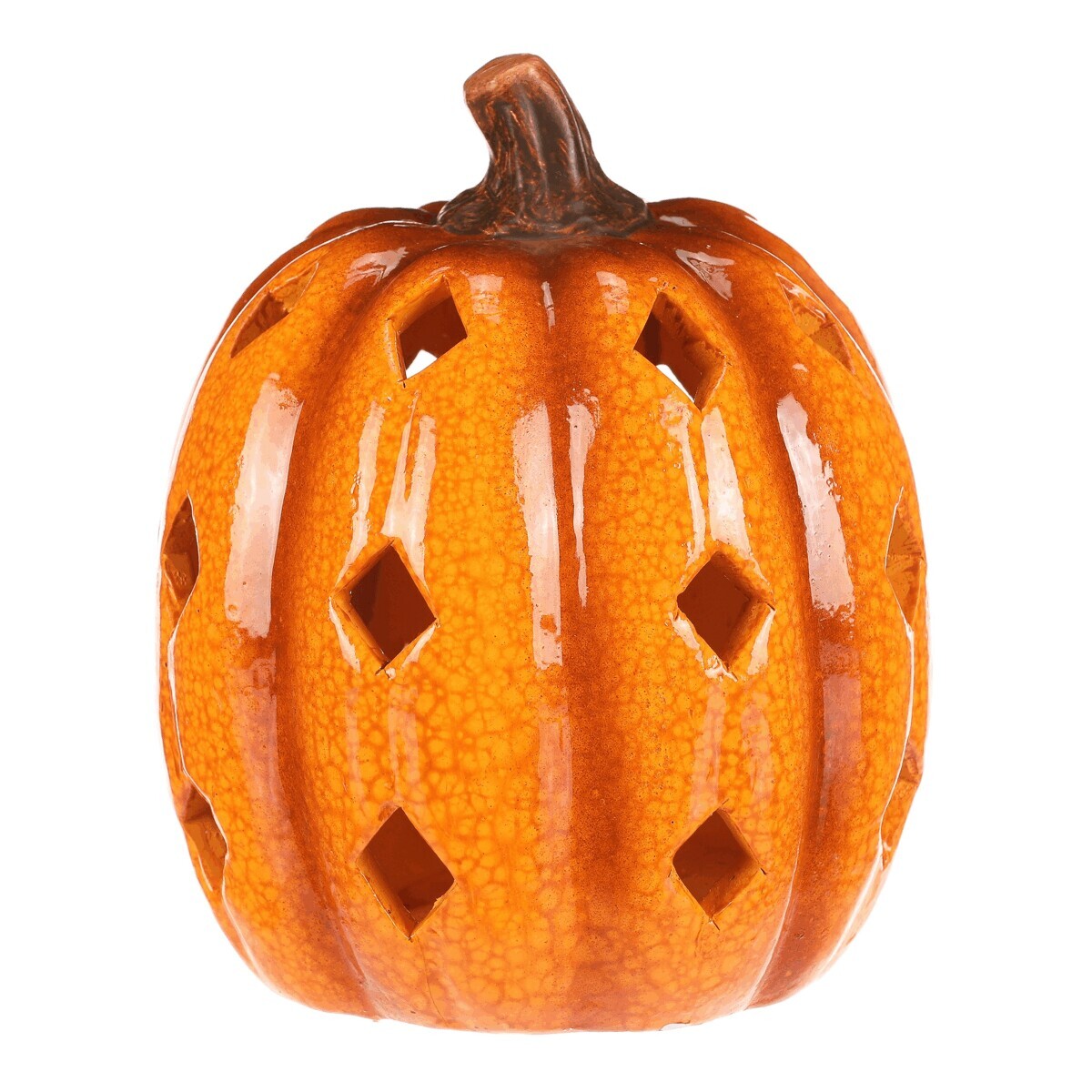 Žluto-oranžová dýně z keramiky s lesklým povrchem a prostorem, ve kterém je umístěné LED osvětlení, navodí tu pravou podzimní atmosféru. Po obvodu se nachází hranaté otvory v prizích, kterými budou po rozsvícení umělé svíce efektně procházet paprsky světla.