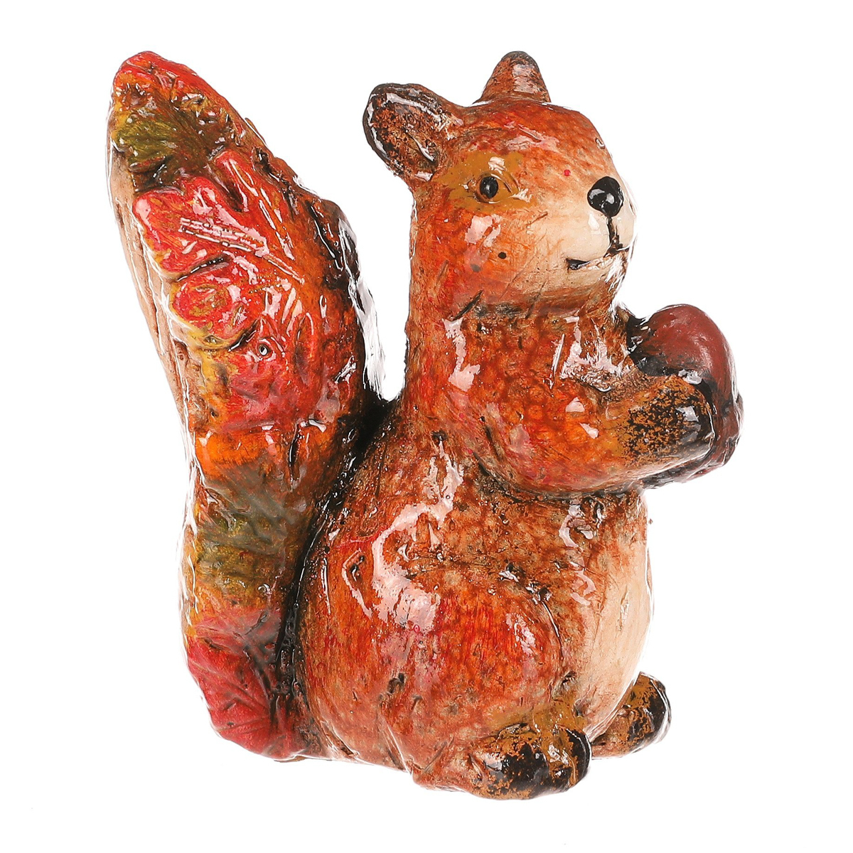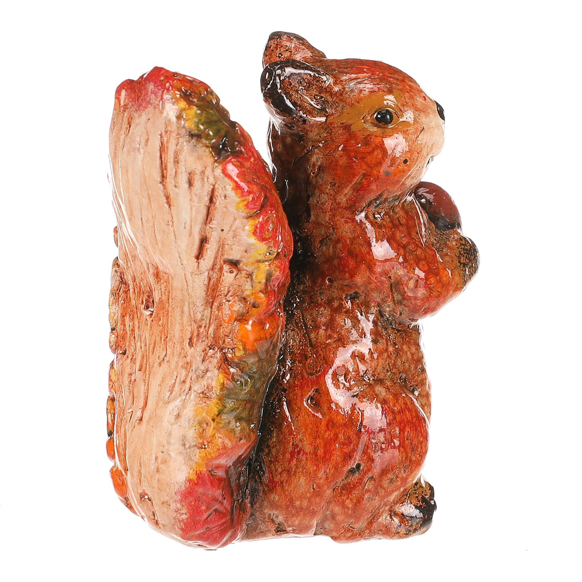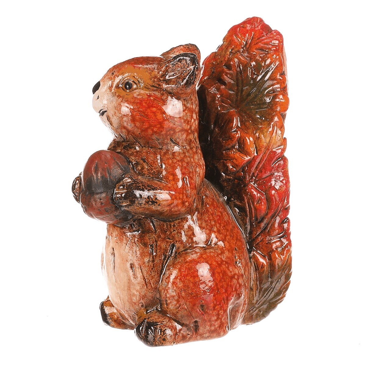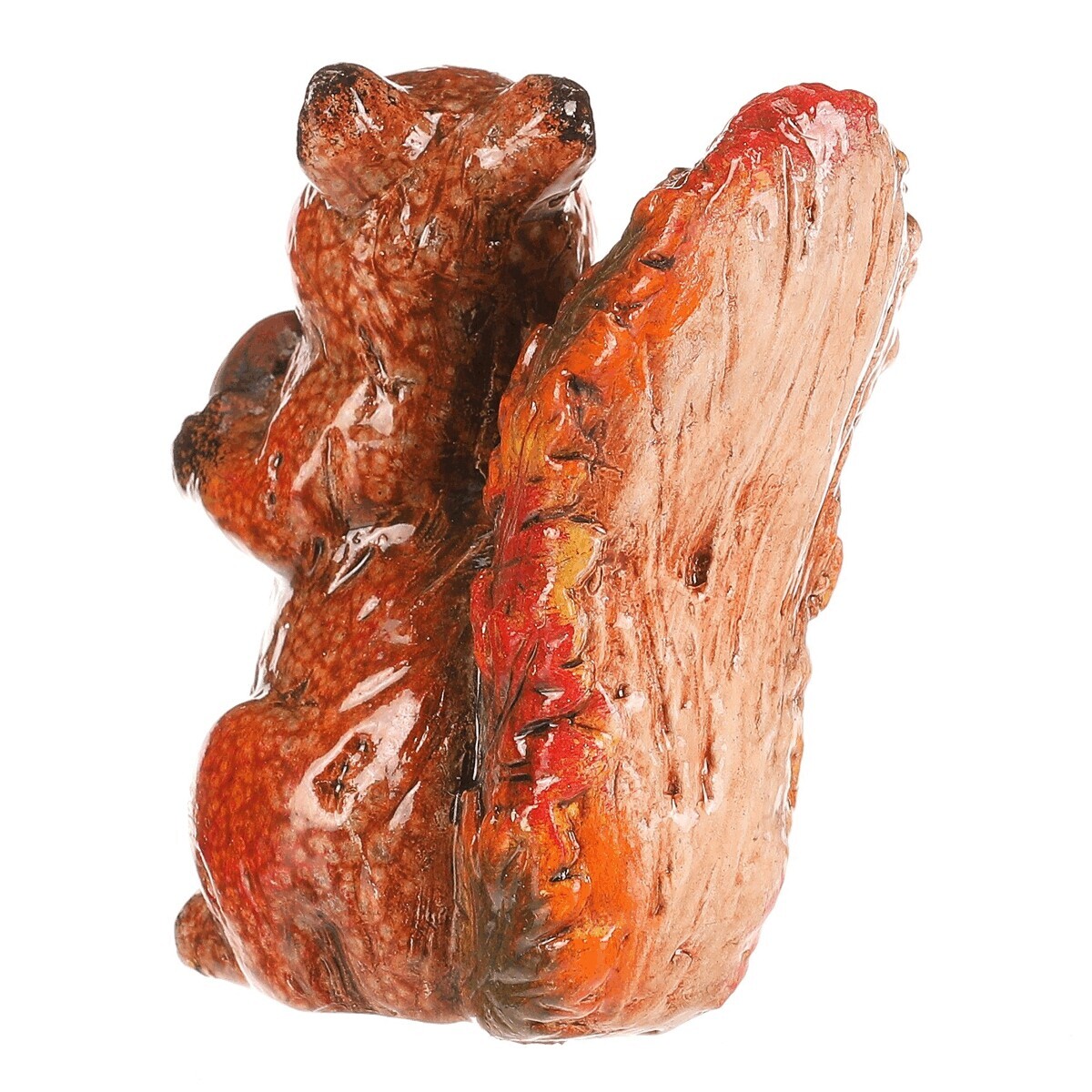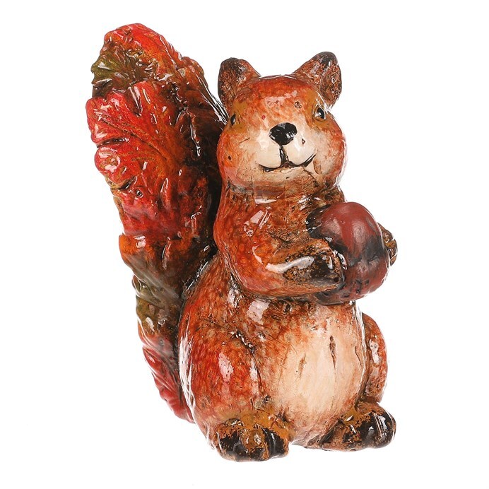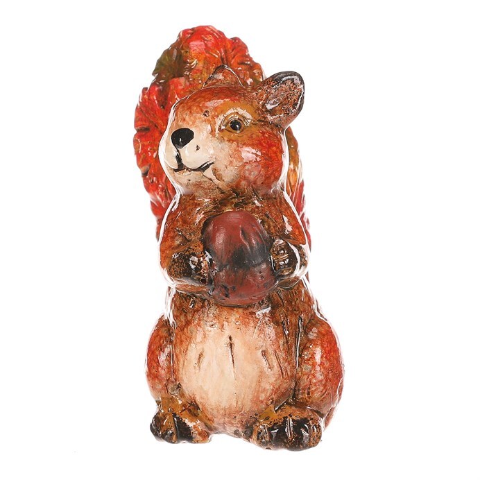 Figurka veverky s oříškem z magnesia pokrytá barevnými lístky v červeno-hnědých tónech je originální dekorace, která zaujme na první pohled. Detailní zpracování a přírodní motivy z ní dělají nádherný doplněk pro váš domov nebo zahradu. Perfektní pro doladění podzimní výzdoby s nádechem barevného lesního království.