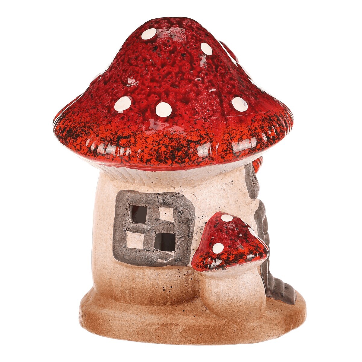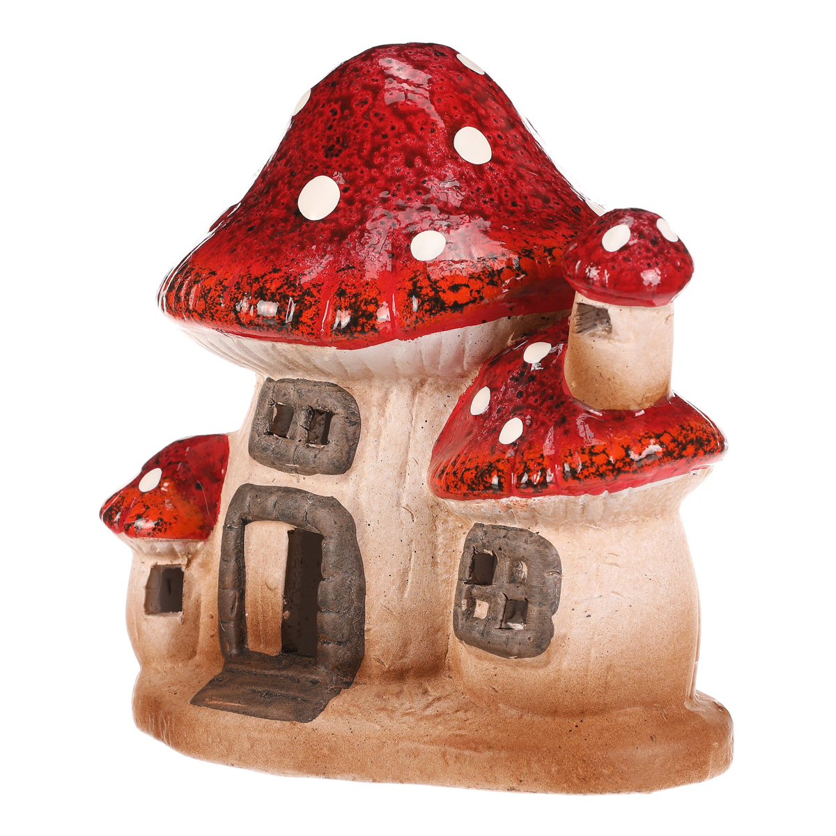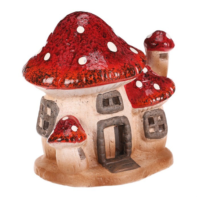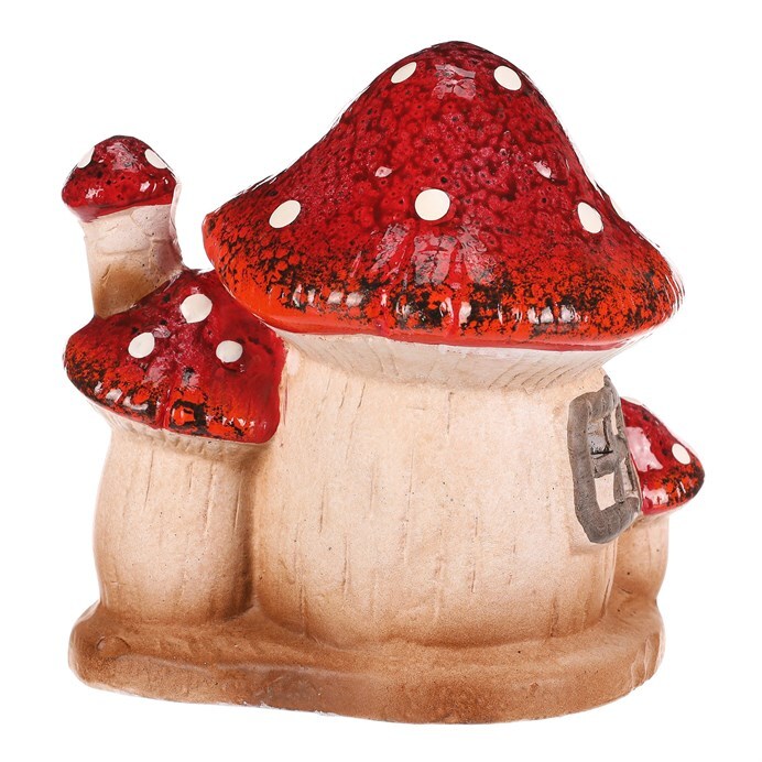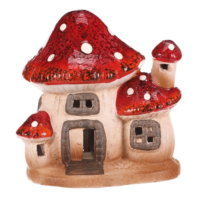 Houbový keramický domeček s LED osvětlením bude skvělou ozdobou pro podzimní období. Domeček je tvořen mochomůrkami červenými s krásně zbarvenými střechami. Jedná se o dvojici větších, které jsou doplněny jednou menší, která nahrazuje komínek a druhou, která stojí hned vedle vchodu. Můžete si tak hravě vytvořit neodolatelné barevné zákoutí s možností vytvořit příjemné světlo během tmavých podzimních večerů.