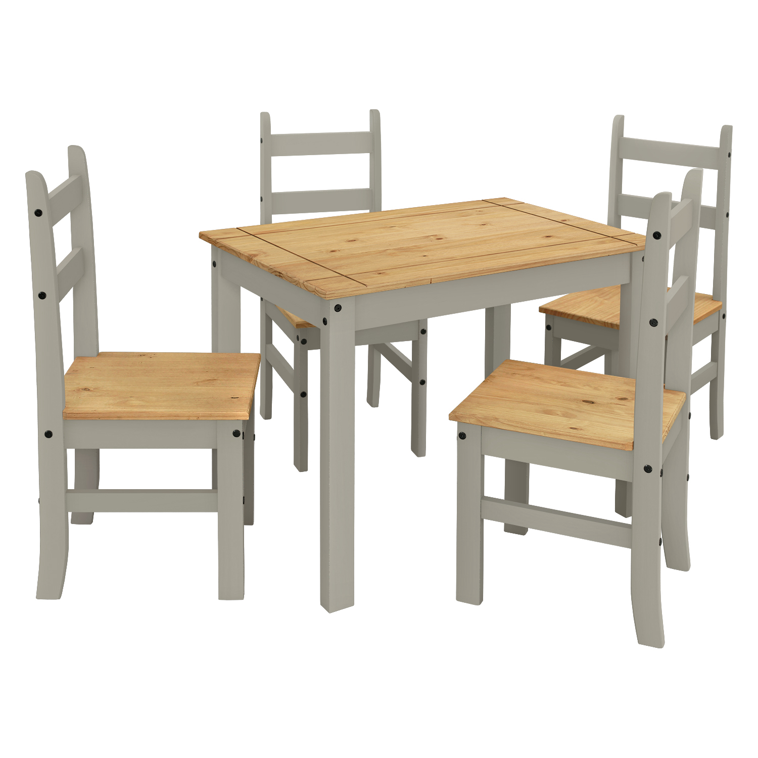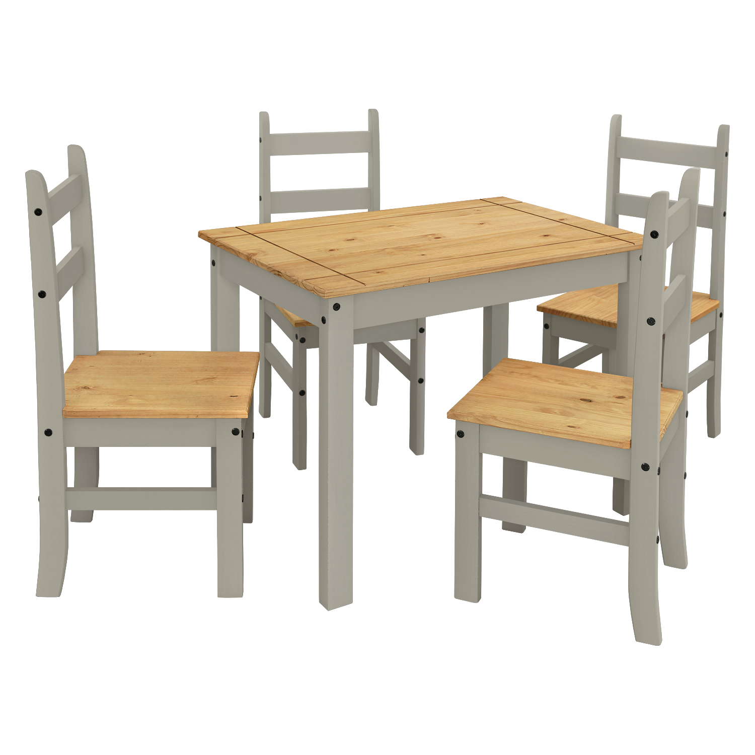 materiál masiv borovice voskovaná v šedém odstínu horní deska stolu a sedáky stoliček masiv borovice voskovaná v medovém odstínu rozměr stolu (š/h/v) 100 × 65 × 75 cm rozměr židle (š/h/v) 40 × 49 × 99 cm, výška sedu 45 cm součást sestavy Corona 3