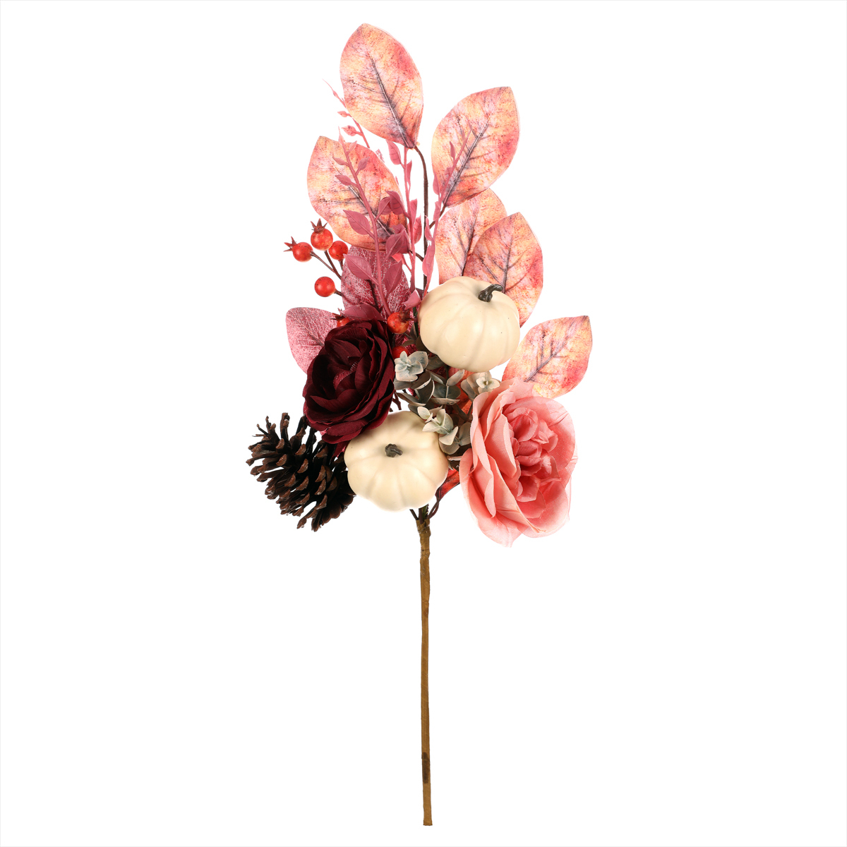 Umělá větev plná podzimní atmosféry spojuje květiny, dýně, šišky, bobule a listí v krásné kombinaci teplých odstínů. Mix květů v bílých, červených a růžových barvách dodává aranžmá jemnost, zatímco drobné dýně, bobule, listí a šišky podtrhují sezónní charakter dekorace. Ideální pro výzdobu stolů, věnců či váz, kde vytvoří útulnou a přirozenou podzimní atmosféru.