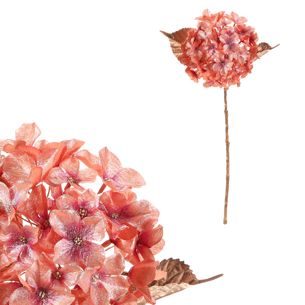 Umělá hortenzie v meruňkovém odstínu s pozlacenými listy a jemným třpytem, přináší do interiéru tu pravou sváteční eleganci. Skvěle se hodí jako vánoční dekorace, ať už samostatně, nebo jako součást větších kytic. Velkou výhodou je, že zůstane krásná napořád bez jakékoli péče.