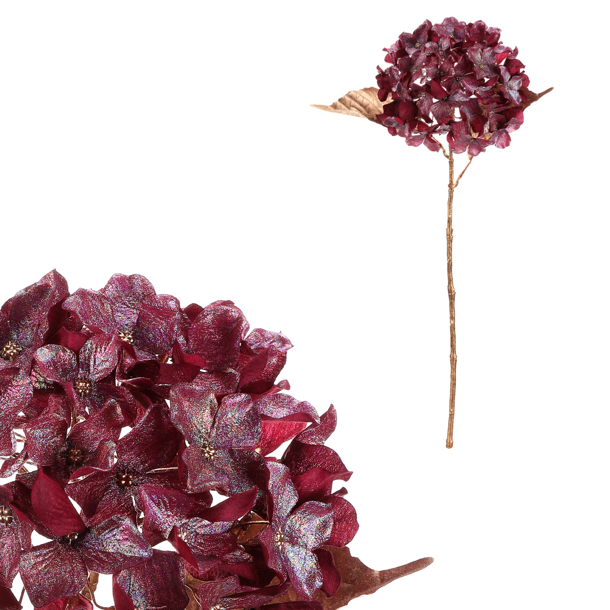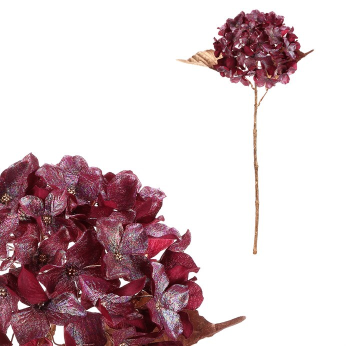 Umělá hortenzie v tmavě červeném odstínu s pozlacenými listy a jemným třpytem, přináší do interiéru tu pravou sváteční eleganci. Skvěle se hodí jako vánoční dekorace, ať už samostatně, nebo jako součást větších kytic. Velkou výhodou je, že zůstane krásná napořád bez jakékoli péče.