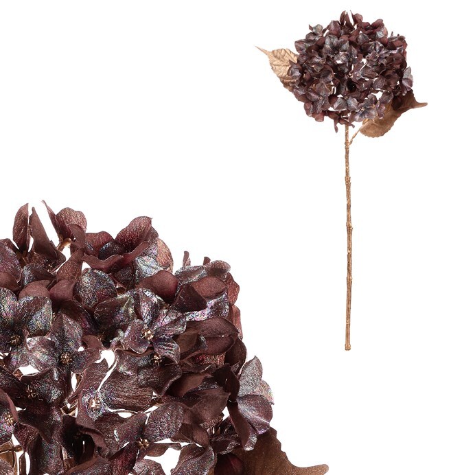 Umělá hortenzie v hnědém odstínu s pozlacenými listy a jemným třpytem, přináší do interiéru tu pravou sváteční eleganci. Skvěle se hodí jako vánoční dekorace, ať už samostatně, nebo jako součást větších kytic. Velkou výhodou je, že zůstane krásná napořád bez jakékoli péče.