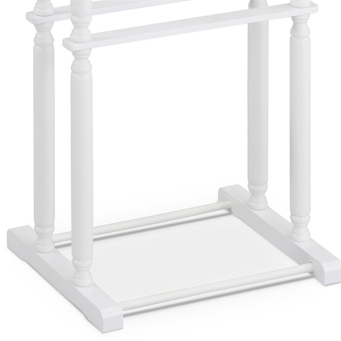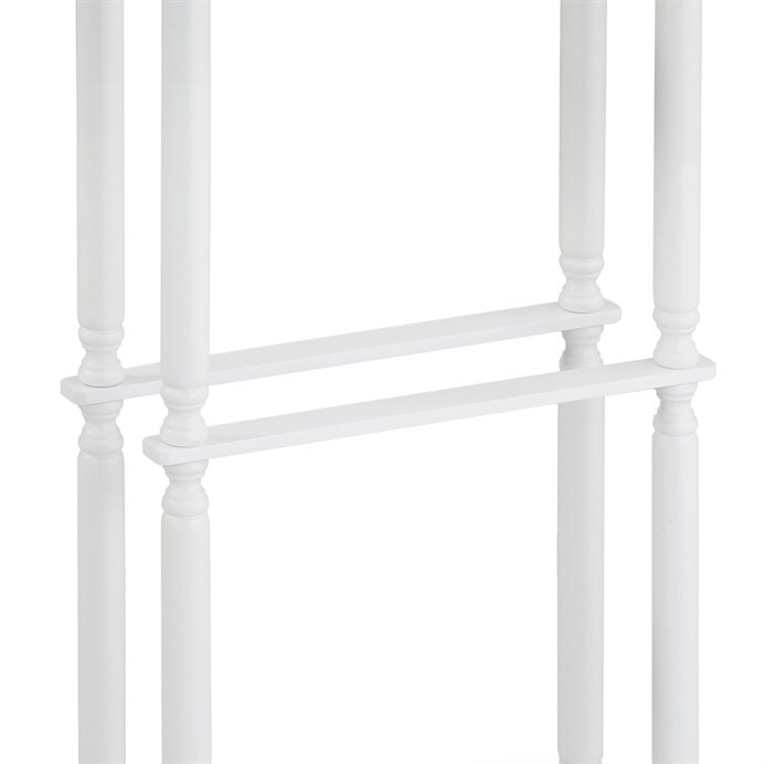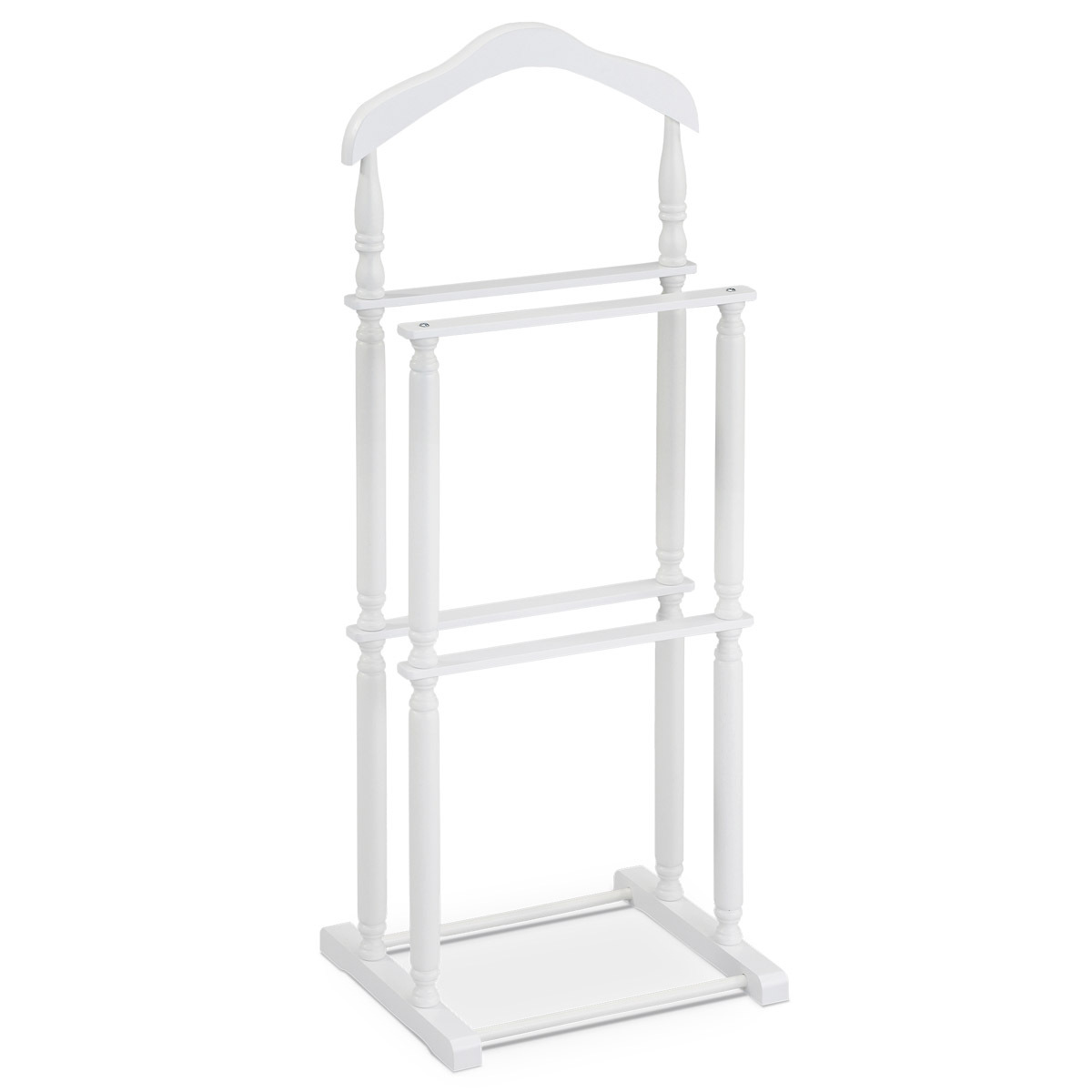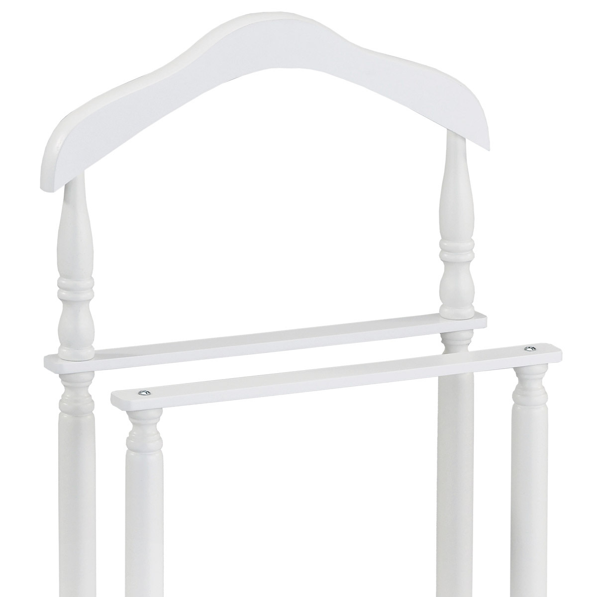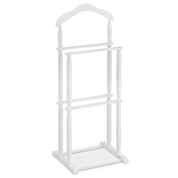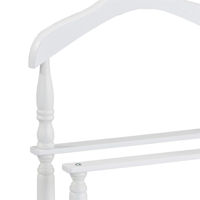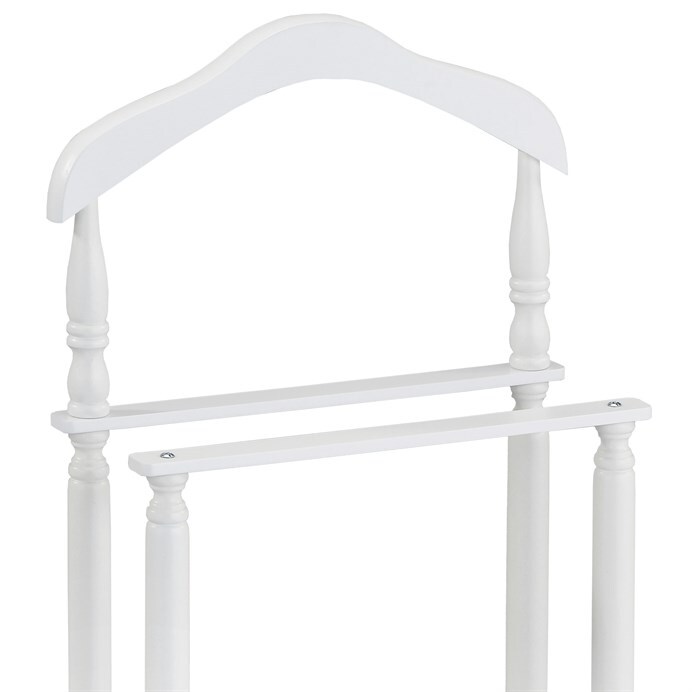 Němý sluha v bílém matném laku je vyroben z masivního kaučukovníku, který zajišťuje pevné a stabilní tělo. Jeho výška 108 cm nabízí dostatek prostoru pro zavěšení oblečení, zatímco spodní část je určena pro uložení kalhot nebo doplňků. Design kombinuje klasické tvary s praktickým využitím, což umožňuje efektivní organizaci oblečení v ložnici či šatně. Povrchová úprava matným lakem usnadňuje údržbu a přispívá k dlouhé životnosti. Nosnost je 7 kg, což odpovídá běžnému zatížení oděvy a doplňky.