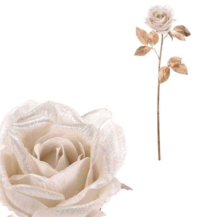 Umělá růže s bílými květy a pozlacenými lístky vnese do vánoční výzdoby jemnost a eleganci. Skvěle se hodí pro aranžování svátečních dekorací, kde její třpytivé detaily krásně vyniknou. Trvalá krása, která vydrží a nepotřebuje žádnou zvláštní péči. Můžete tak tuto umělou květinu v netradičním barevném pojetí používat pro aranžování i v dalších sezónách.
