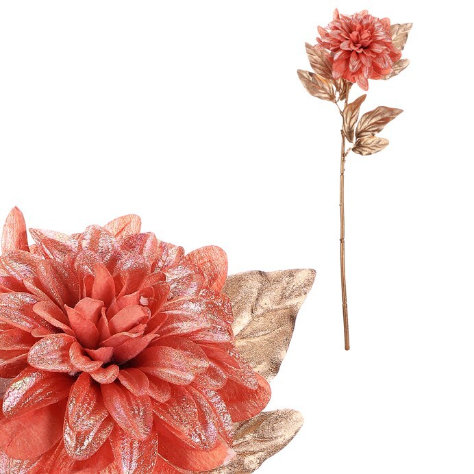 Umělá jiřina s meruňkovými květy a pozlacenými lístky vnese do vánoční výzdoby jemnost a eleganci. Skvěle se hodí pro aranžování svátečních dekorací, kde její třpytivé detaily krásně vyniknou. Trvalá krása, která vydrží a nepotřebuje žádnou zvláštní péči. Můžete tak tuto umělou květinu v netradičním barevném pojetí používat pro aranžování i v dalších sezónách.