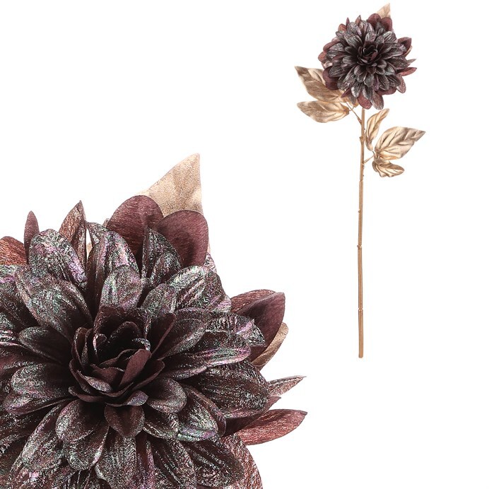 Umělá jiřina s hnědými květy a pozlacenými lístky vnese do vánoční výzdoby jemnost a eleganci. Skvěle se hodí pro aranžování svátečních dekorací, kde její třpytivé detaily krásně vyniknou. Trvalá krása, která vydrží a nepotřebuje žádnou zvláštní péči. Můžete tak tuto umělou květinu v netradičním barevném pojetí používat pro aranžování i v dalších sezónách.