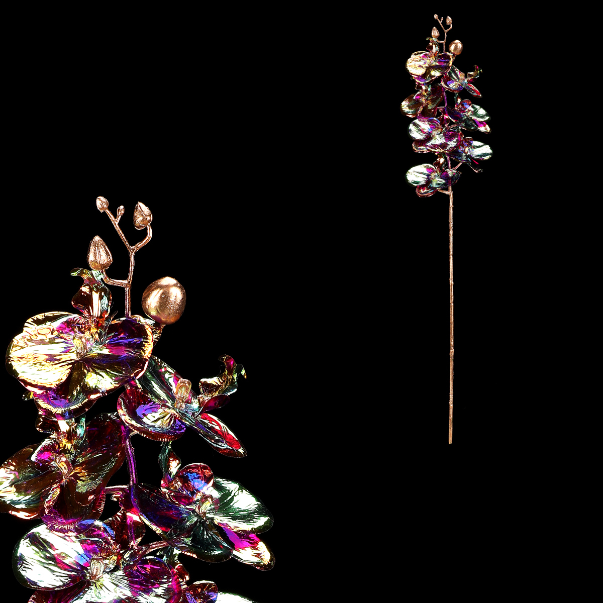 Umělá hortenzie s pozlaceným stonkem a lístky okouzlí svým pestrobarevným květem. Její plastové okvětní lístky mění své barvy podle úhlu pohledu. Elegantní a působivá dekorace, která dodá výzdobám šmrnc a zůstane stejně krásná napořád.