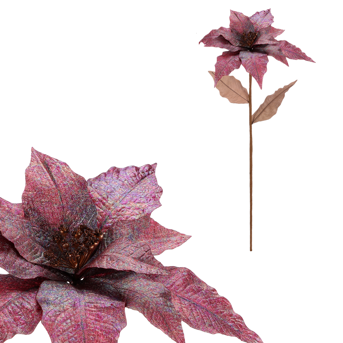 Umělá vánoční růže s fialovým květem zdobeným drobnými třpytkami vnese do sváteční výzdoby nádech elegance a jemnosti. Krásně se hodí do vánočních výzdob, kde její zářivý vzhled dokonale vynikne a nikdy neuvadne.