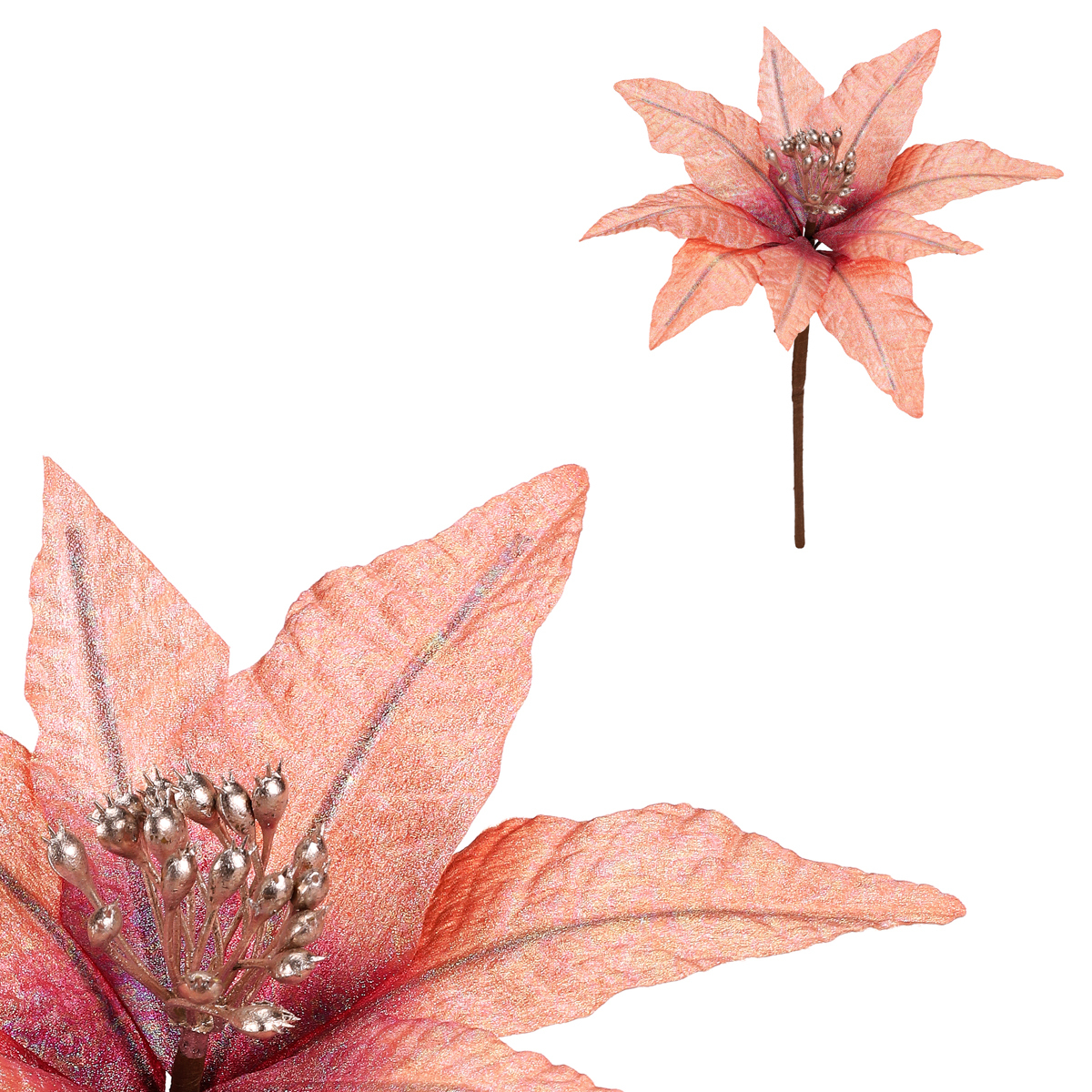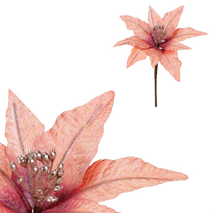 Vánoční růže na stonku v meruňkové barvě se třpytkami přináší do vašeho interiéru elegantní a sváteční atmosféru. Ideální pro vánoční výzdobu, kde její jemný třpyt okouzlí a rozzáří každý kout vaší místnosti.