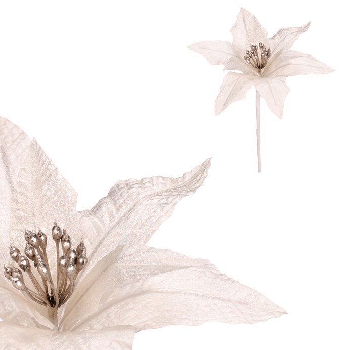 Vánoční růže na stonku v bílé barvě se třpytkami přináší do vašeho interiéru elegantní a sváteční atmosféru. Ideální pro vánoční výzdobu, kde její jemný třpyt okouzlí a rozzáří každý kout vaší místnosti.