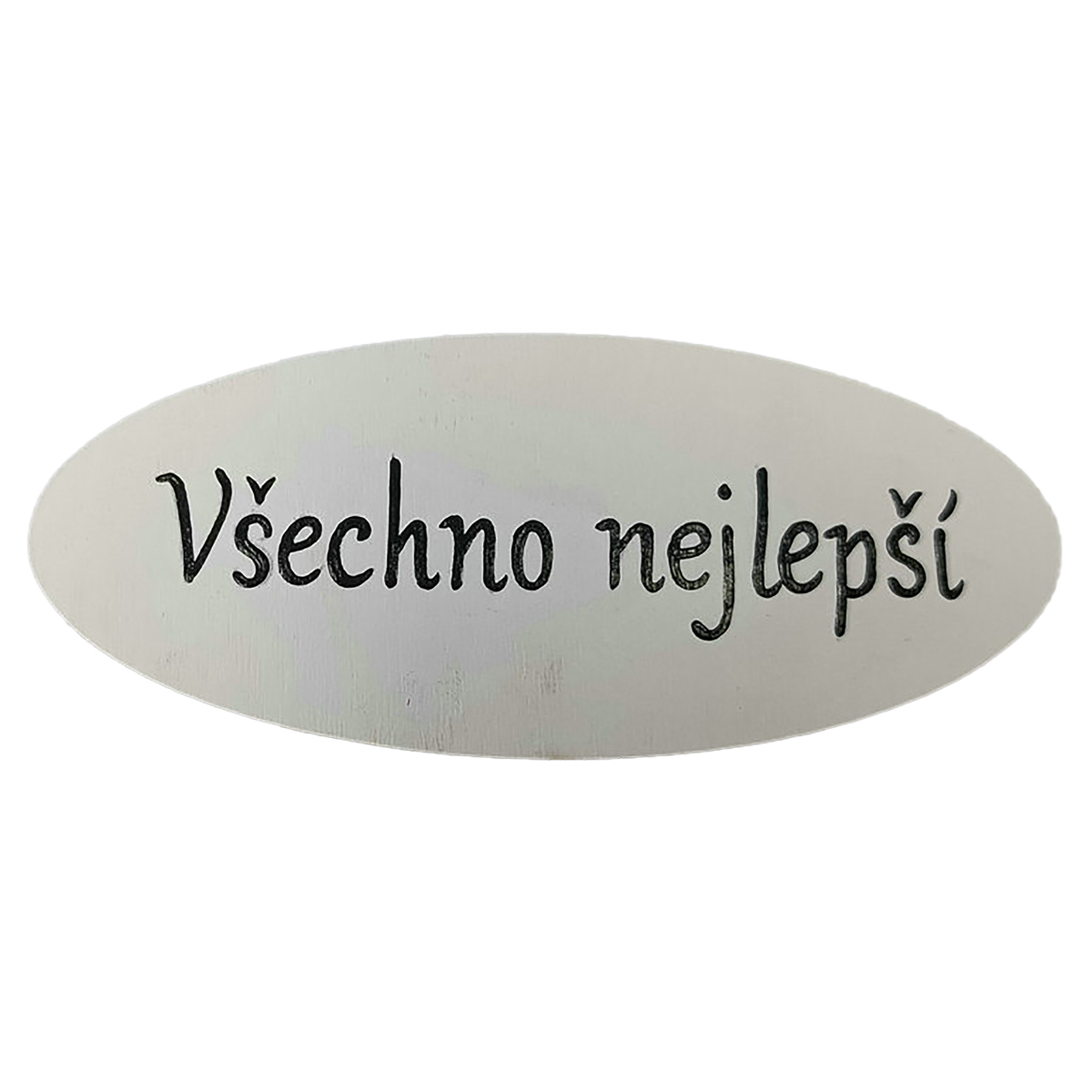 Dřevěná oválná cedulka s nápisem „Všechno nejlepší“ bude perfektním doplňkem pro ozdobu a dekorování při oslavách narozenin či svátků. Cedulka je bílá a má černý nápis. V jednom sáčku je 12 kusů, přičemž cena je uvedena za jeden kus.