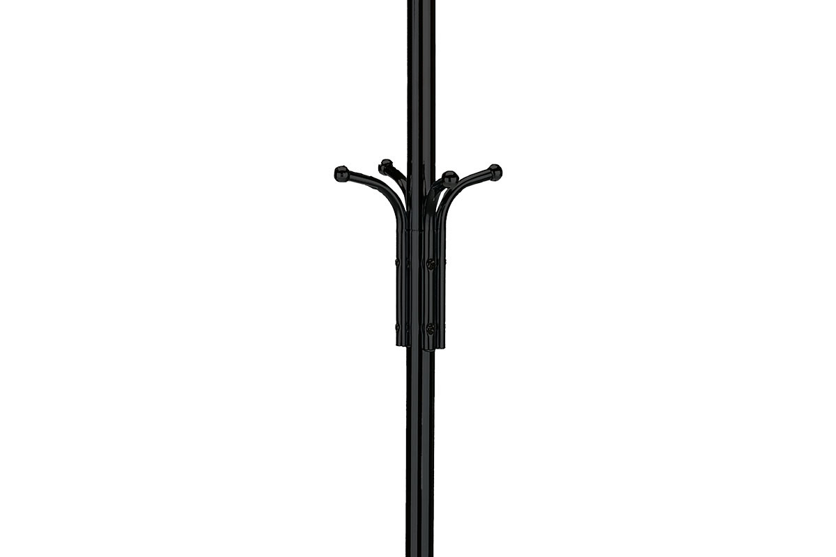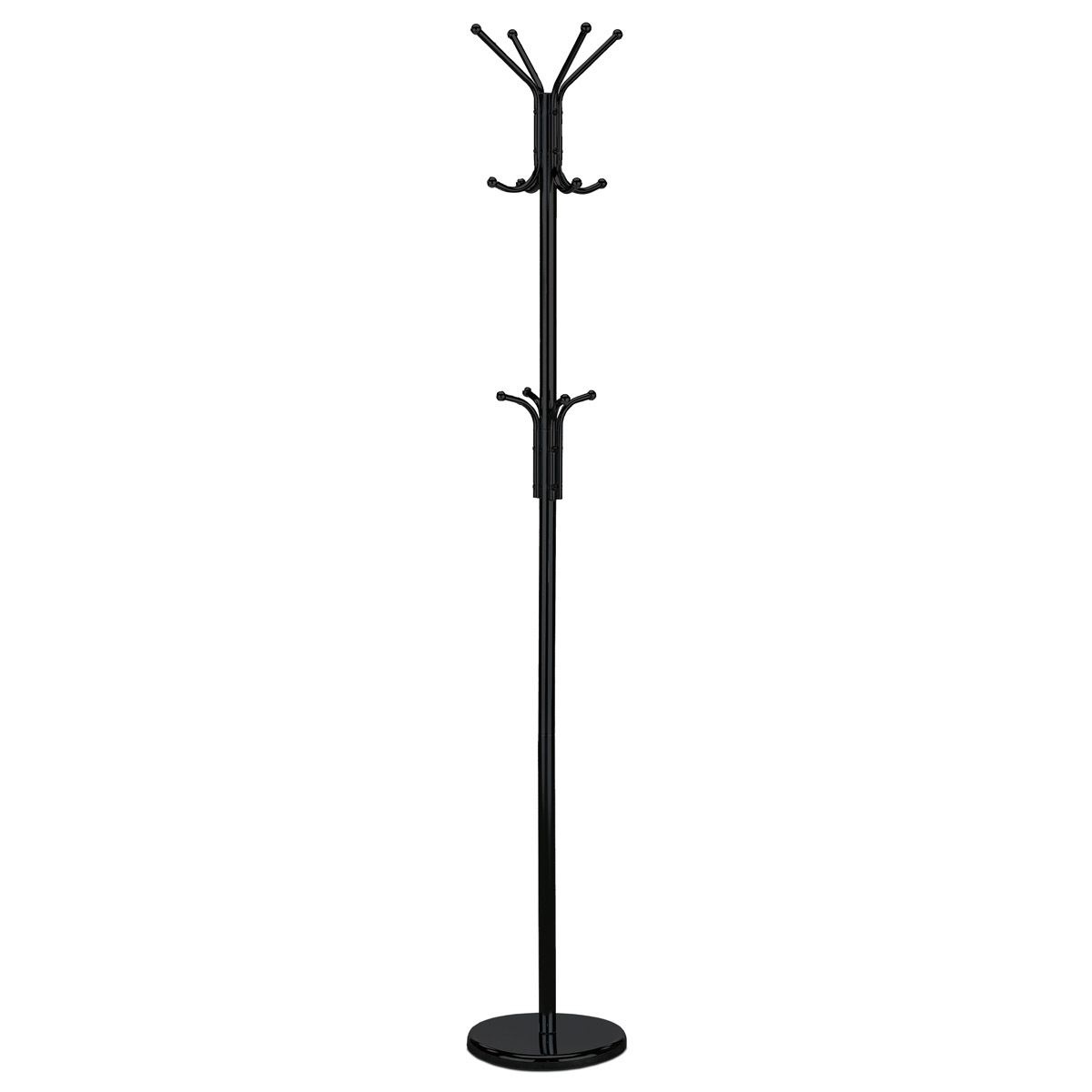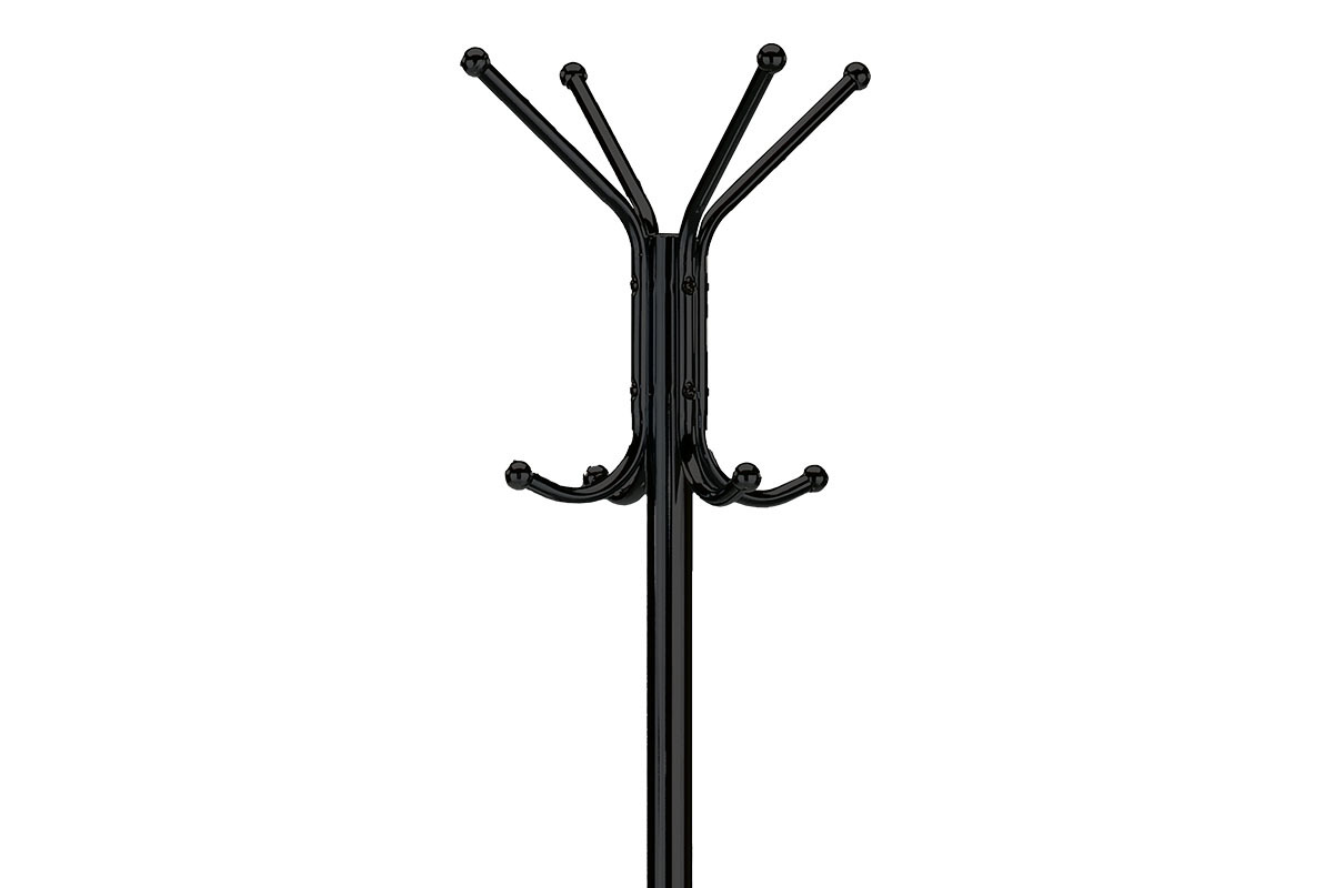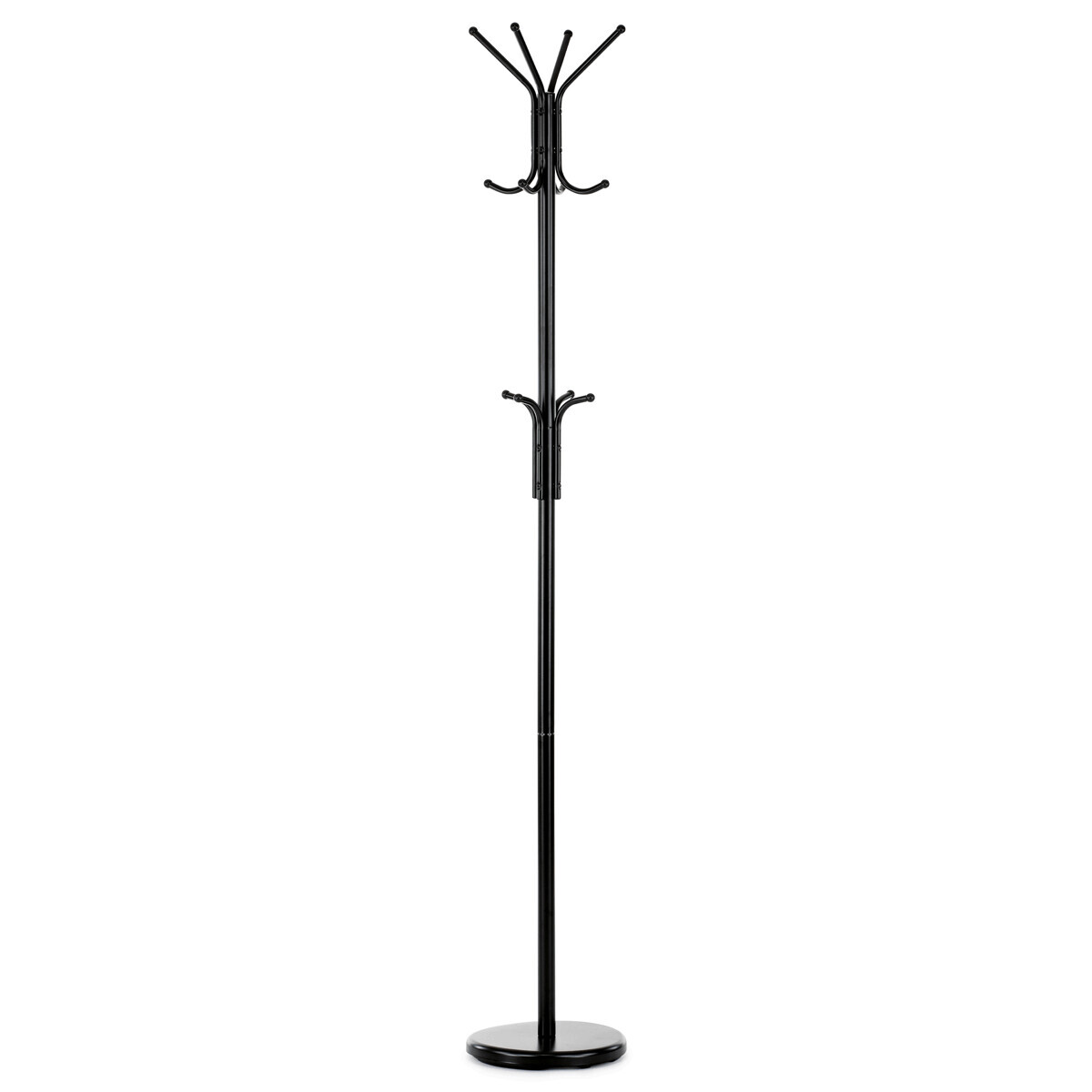 Stojanový věšák s výškou 182 cm je vyroben z pevného kovu s matnou černou povrchovou úpravou, která zajišťuje odolnost proti poškození a snadnou údržbu. Věšák nabízí celkem deset háčků rozmístěných ve dvou úrovních, což umožňuje efektivní zavěšení kabátů, klobouků či tašek. Stabilní kulatá základna přispívá k bezpečnému postavení a nosnost 10 kg odpovídá běžným nárokům na zavěšení více kusů oblečení. Díky jednoduchému a funkčnímu designu se hodí do kanceláří, vstupních hal i domácností.
