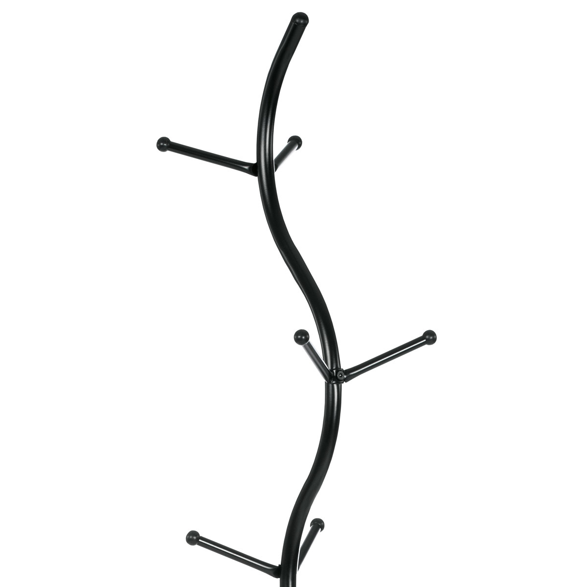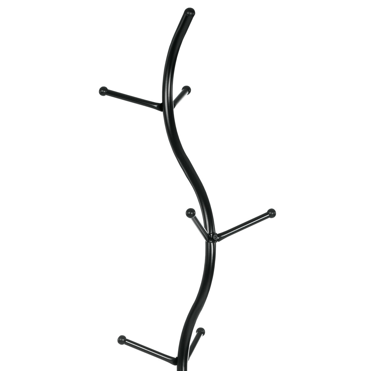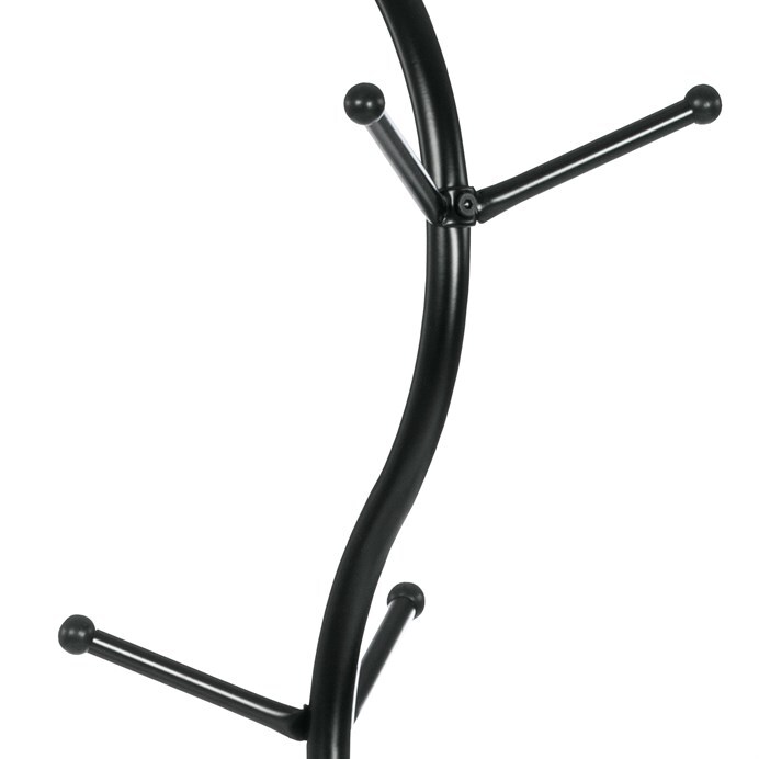 Stojanový věšák s výškou 180 cm je vyroben z pevného kovu s matnou černou povrchovou úpravou, která zajišťuje odolnost proti poškození a snadnou údržbu. Design věšáku je tvořen elegantně prohnutou hlavní tyčí s šesti rozloženými háčky zakončenými kulatými koncovkami, které zabraňují sklouznutí oděvů. Stabilní kulatá základna poskytuje dostatečnou oporu a zaručuje bezpečné postavení i při plném zatížení do 10 kg. Věšák je vhodný pro umístění v předsíních, kancelářích či čekárnách, kde kombinuje funkčnost s minimalistickým moderním vzhledem.