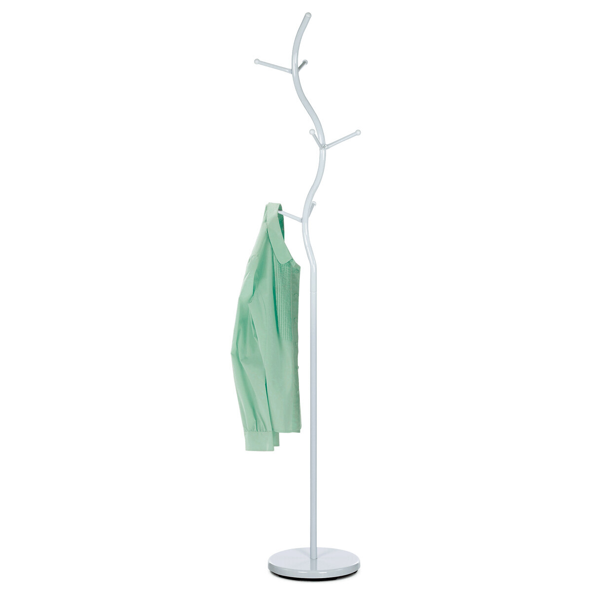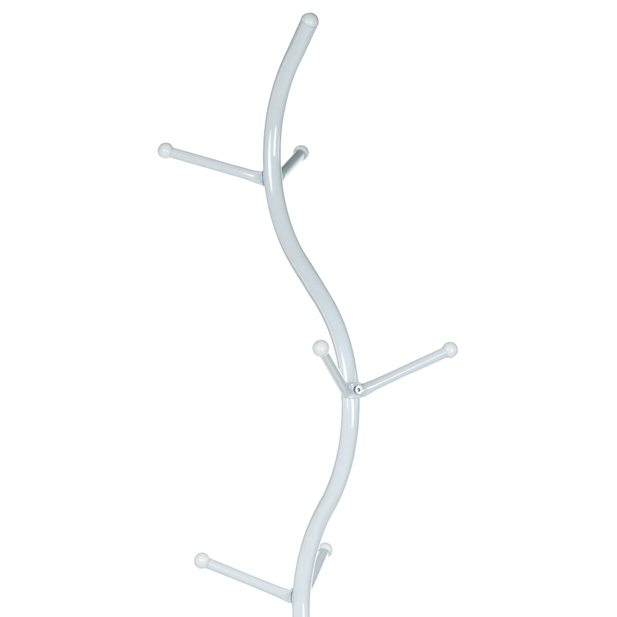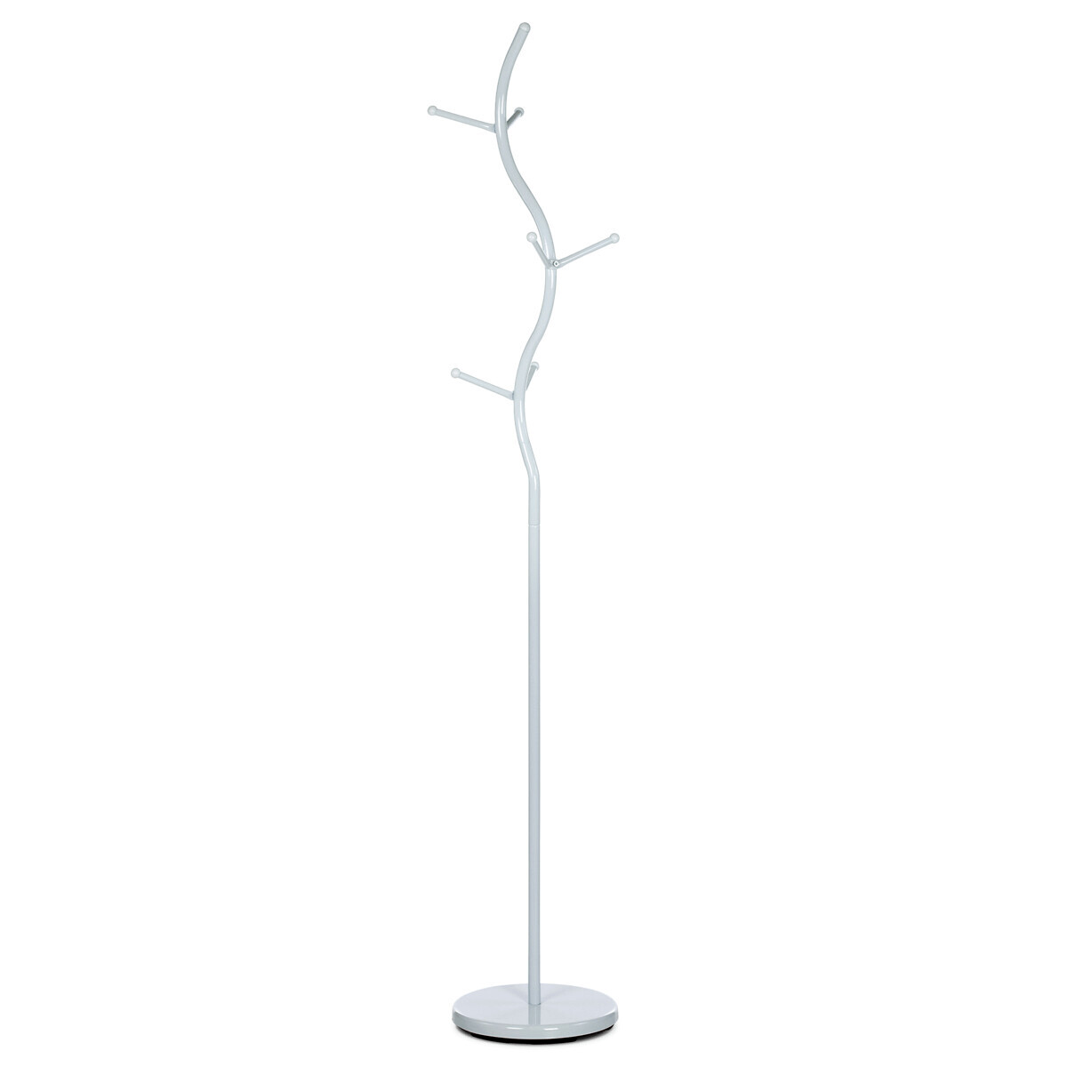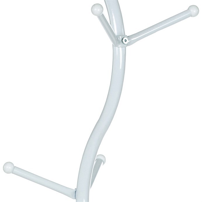 Stojanový věšák s výškou 180 cm je vyroben z pevného kovu s matným bílým lakem, který zajišťuje odolnost proti poškození a snadnou údržbu. Jeho design tvoří elegantně prohnutá centrální tyč s šesti rozloženými háčky různých délek, které umožňují pohodlné zavěšení kabátů, klobouků či tašek. Stabilní kulatá základna přispívá k celkové stabilitě věšáku, který unese až 10 kg. Díky svému jednoduchému a modernímu vzhledu se hodí do vstupních hal, kanceláří i domácností.