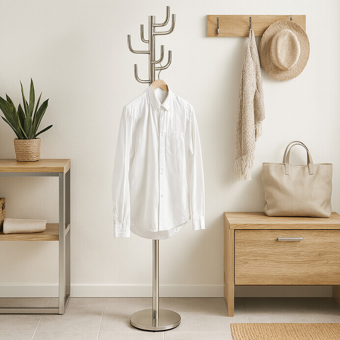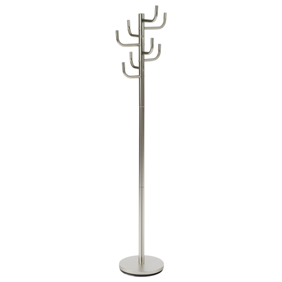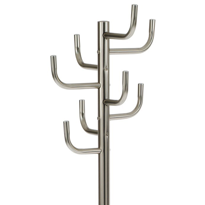 Stojanový věšák s kovovým provedením v broušeném niklu nabízí praktické řešení pro uspořádání oděvů a doplňků v interiéru. Je vybaven osmi pevnými háčky rozmístěnými do tří úrovní, které umožňují efektivní využití prostoru a snadný přístup k zavěšeným věcem. Stabilní kruhová základna zajišťuje bezpečnou oporu a celkovou stabilitu věšáku, jehož výška činí 175 cm. Povrchová úprava broušeným niklem přispívá k odolnosti proti poškození a usnadňuje údržbu. Nosnost věšáku je 10 kg, což odpovídá běžným požadavkům na zavěšení kabátů, šál či tašek.