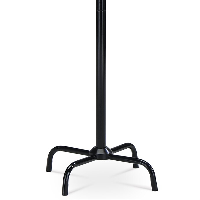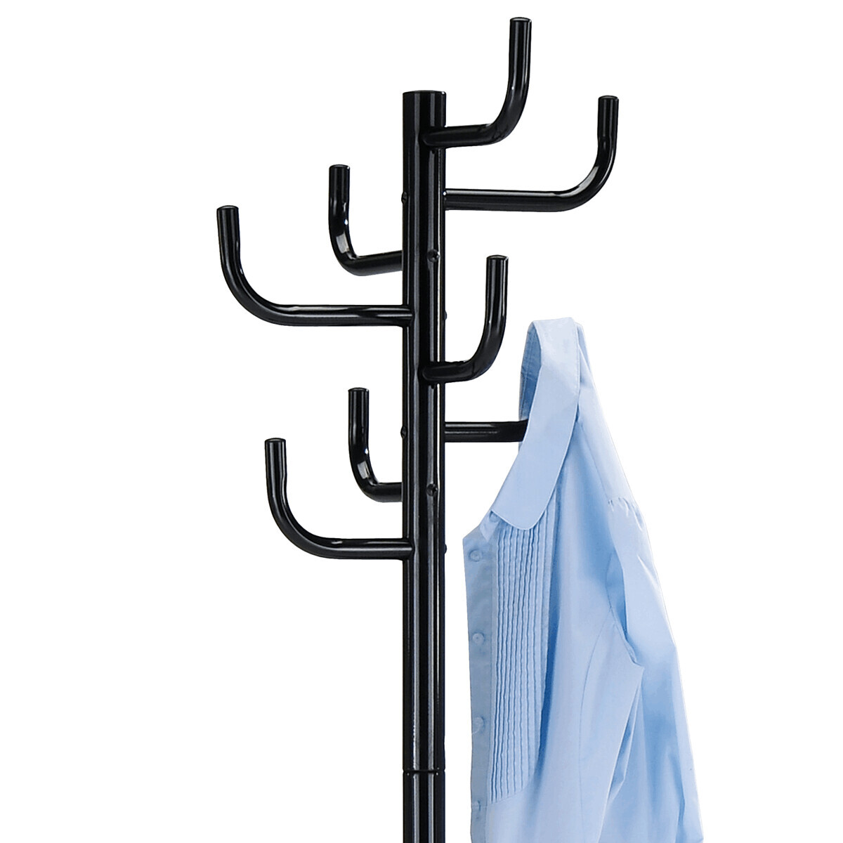 Stojanový věšák s výškou 182 cm je vyroben z pevného kovu s černým lesklým lakem, který zajišťuje odolnost a snadnou údržbu. Nabízí osm robustních háčků rozmístěných do tří úrovní, které umožňují efektivní uspořádání oděvů, klobouků či doplňků. Stabilní čtyřnohá základna přispívá k bezpečnému postavení i při plném zatížení, přičemž maximální nosnost věšáku je 10 kg. Jeho jednoduchý a funkční design se hodí do různých interiérů, od kanceláří po domácnosti, kde poskytuje praktické řešení pro ukládání svršků.