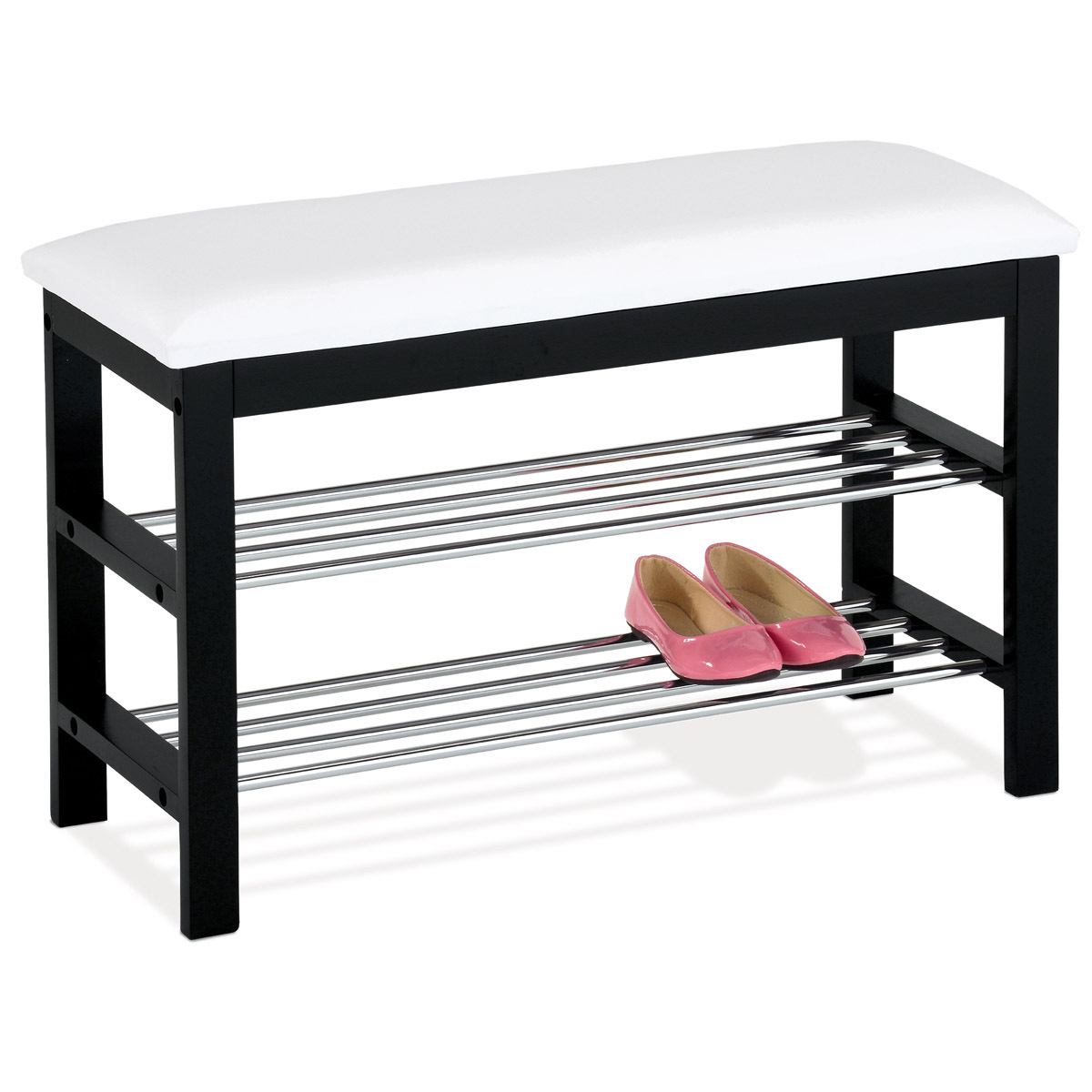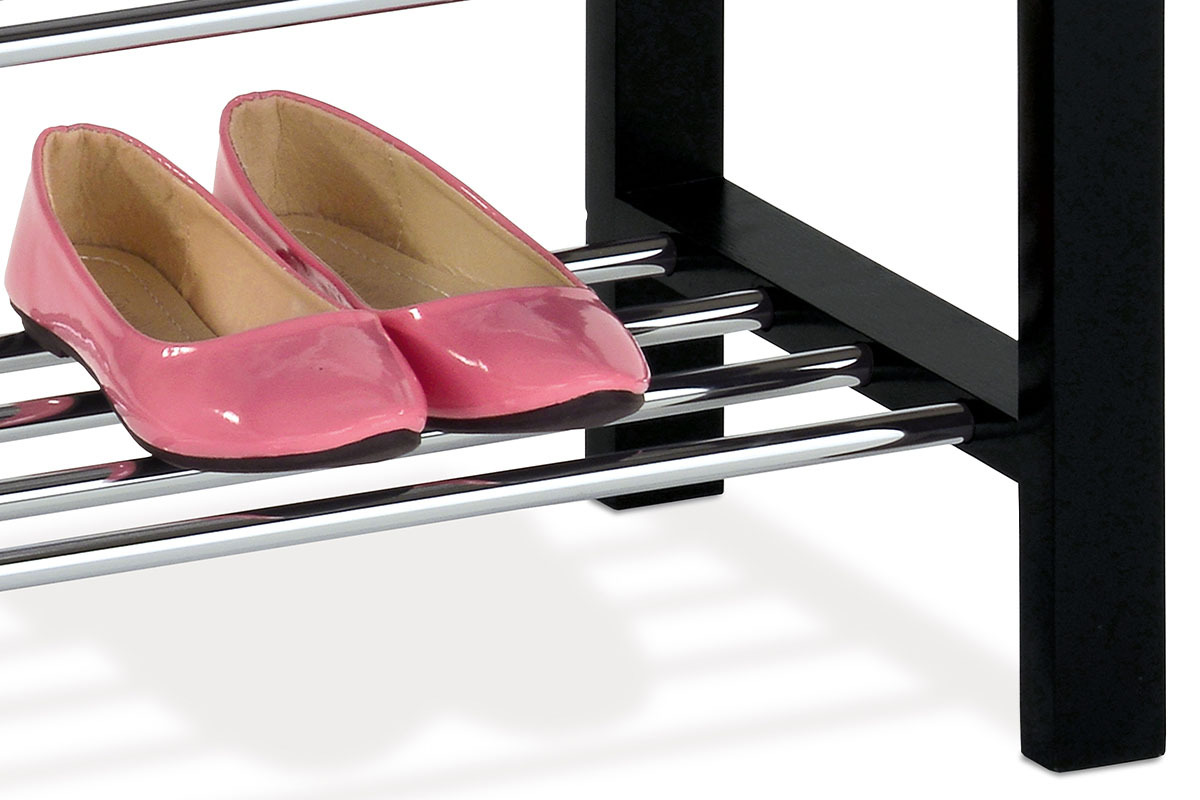 Praktický botník s taburetem kombinuje černě lakované masivní dřevo kaučukovníku s bílým potahem z ekokůže, který nabízí pohodlné sezení při obouvání. Dvě chromované police poskytují dostatek místa pro uložení obuvi, přičemž jejich kovové provedení zajišťuje pevnost a snadnou údržbu. Kompaktní rozměry a jednoduchý design umožňují snadné začlenění do předsíní i menších prostor. Stabilní rám z masivu zaručuje dlouhou životnost a odolnost vůči každodennímu používání. Tento botník je ideálním řešením pro organizaci obuvi s přidaným komfortem sedací plochy.