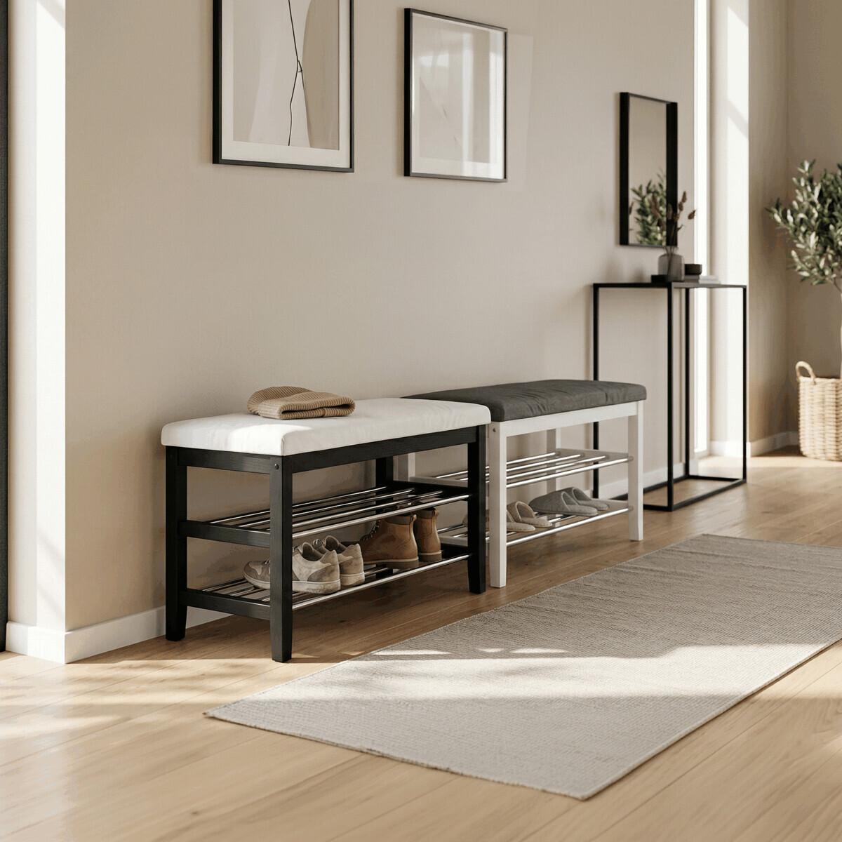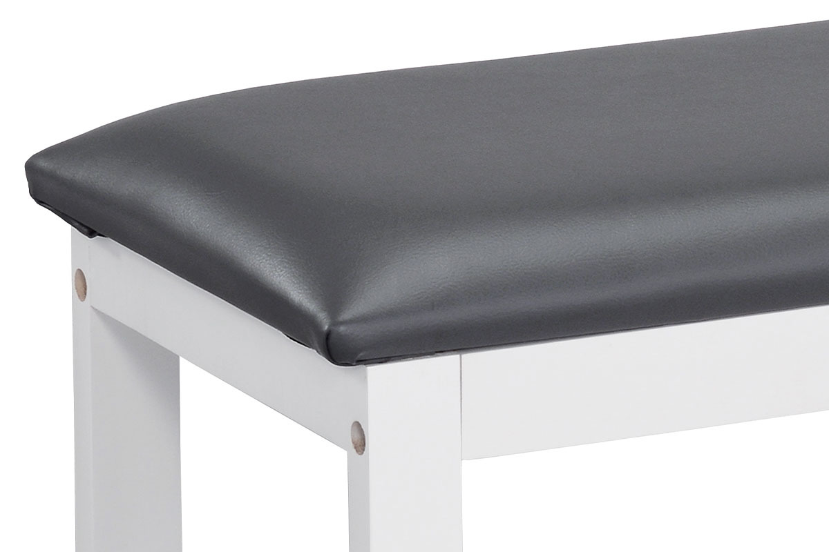 Botník s taburetem kombinuje praktické uspořádání s pohodlným posezením díky polstrovanému sedáku potaženému šedou ekokůží. Masivní rám z kaučukovníku v bílé barvě je doplněn o dvě chromované police, které nabízejí dostatek prostoru pro uložení obuvi. Pevné provedení zajišťuje stabilitu a dlouhou životnost, zatímco jednoduchý design umožňuje snadné začlenění do různých interiérů. Výška a rozměry taburetu jsou přizpůsobeny pro pohodlné sezení i praktické využití v předsíni či chodbě.
