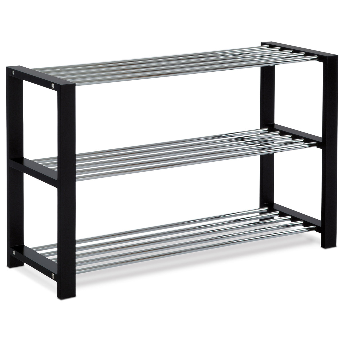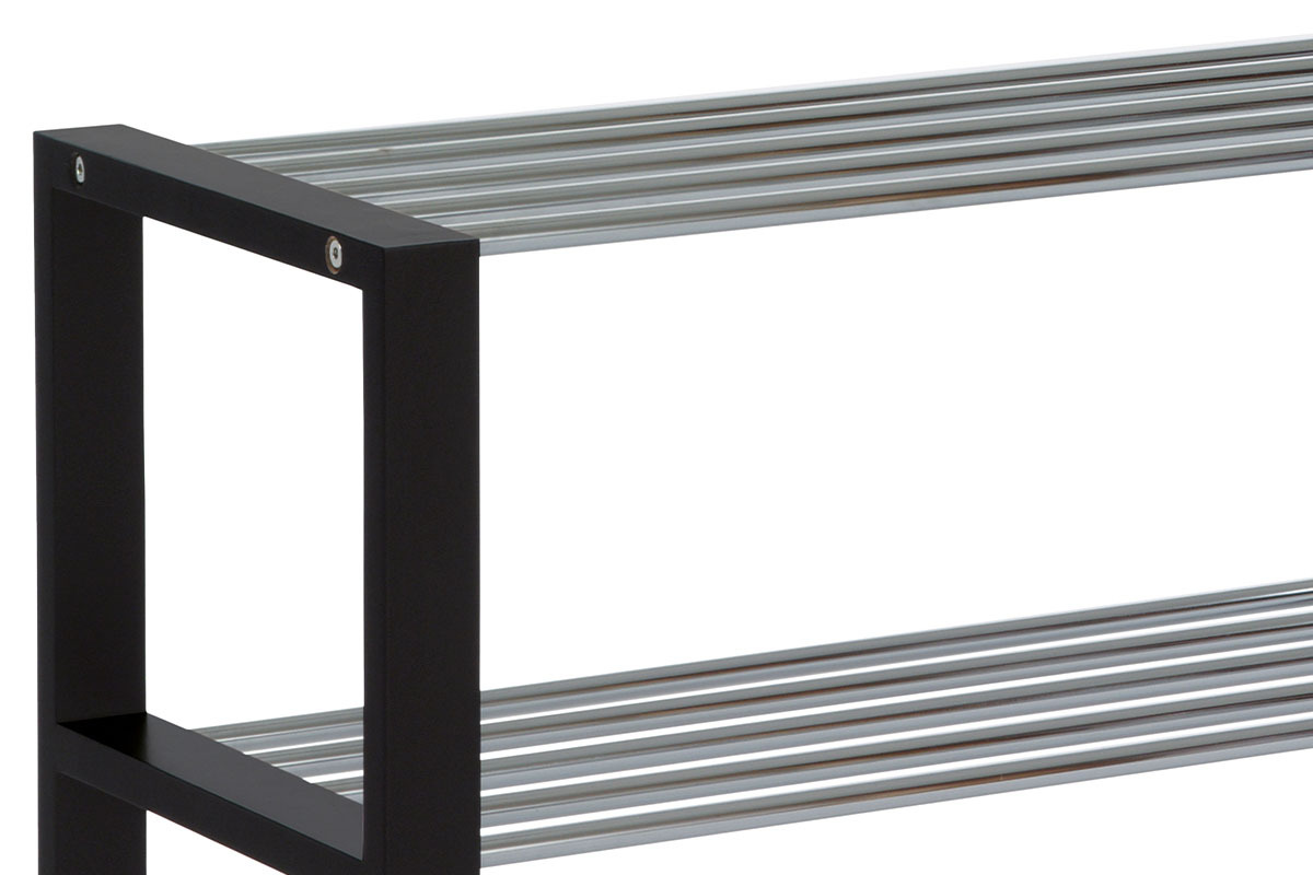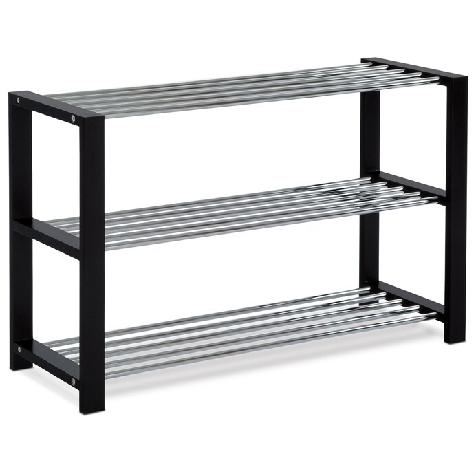 Botník s třemi policemi nabízí praktické a pevné řešení pro uskladnění obuvi v domácnosti. Masivní rám z kaučukovníku je opatřen černým matným lakem, který podtrhuje jeho moderní vzhled a zajišťuje snadnou údržbu. Police jsou tvořeny chromovanými kovovými tyčemi, které poskytují dostatečnou pevnost a zároveň umožňují cirkulaci vzduchu kolem bot. Kompaktní rozměry botníku umožňují jeho umístění v předsíních i menších prostorách. Stabilní provedení a kvalitní materiály zaručují dlouhou životnost a spolehlivost při každodenním používání.