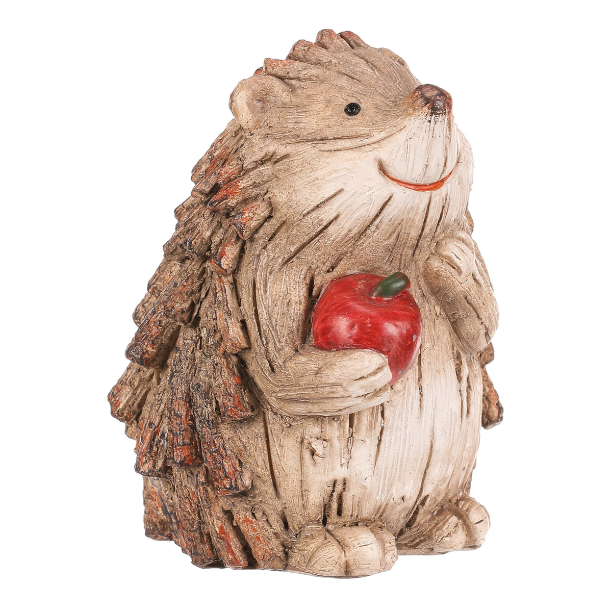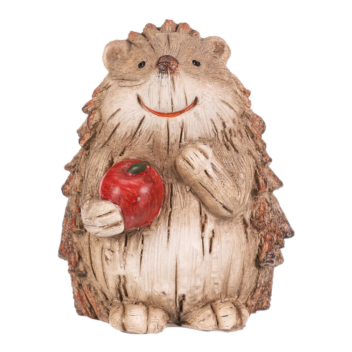 Zahradní figurka v podobě ježka svým provedením krásně zapadne mezi keře a další dřeviny, čímž vytvoříte nádherné lesní zátiší. Ježek v béžovo-hnědých odstínech a s červeným jablíčkem je vyroben z polyresinu, ale vypadá jako by byl právě ze dřeva. Jeho bodliny jsou tvořeny jakoby drobnými nasekanými částmi větviček.