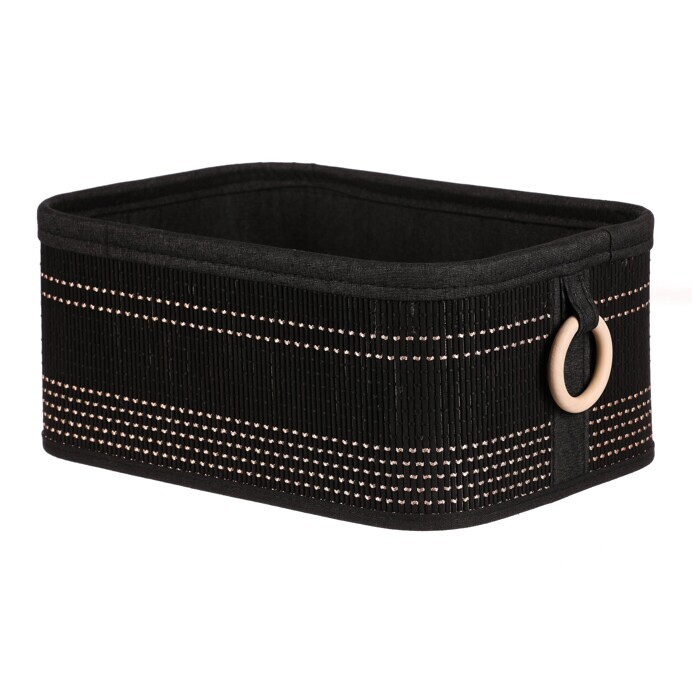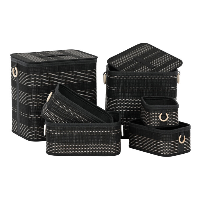 Sada šesti stylových košů v černo-bílém provedení s bambusovým povrchem spojuje praktičnost s elegantním vzhledem. Dva největší slouží jako prádelní koše s víkem, menší jsou ideální do regálů nebo polic. Díky různým velikostem nabízí variabilní možnosti pro ukládání prádla, oblečení i drobností. Skvěle poslouží doma i na chalupě, přičemž snadněji udrží prostory uspořádané a čisté.