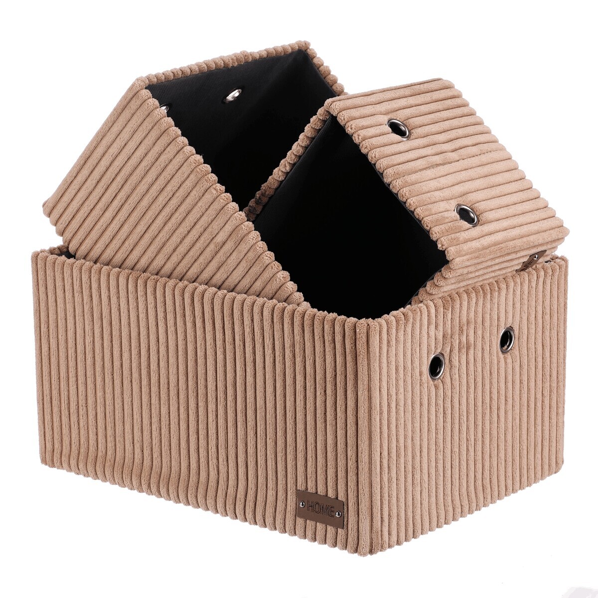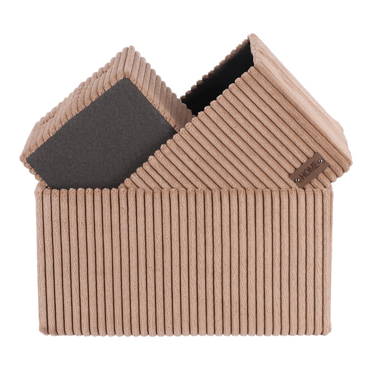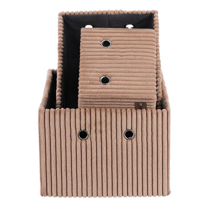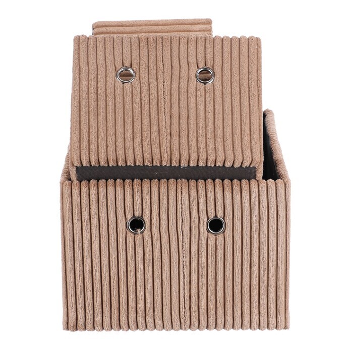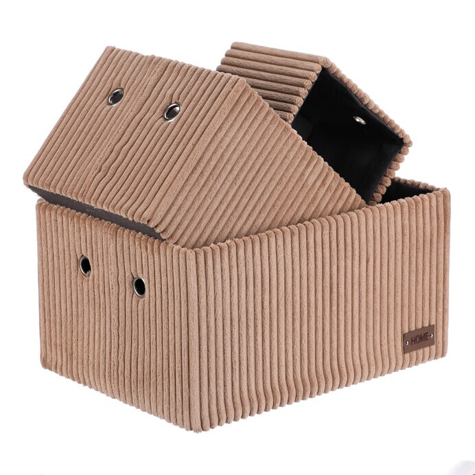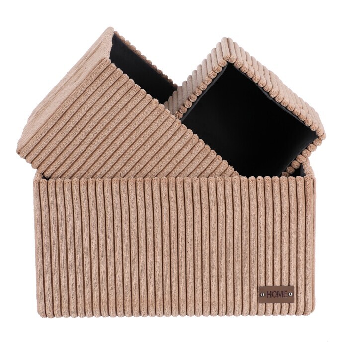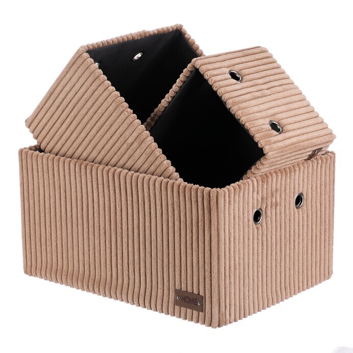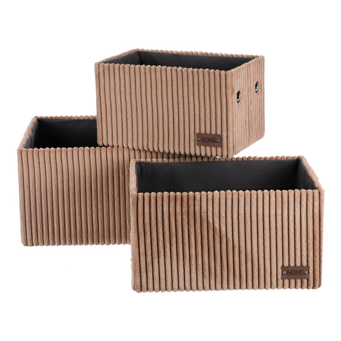 Sada tří látkových regálových košů o třech různých velikostech s manšestrovým potahem přinese do vaší domácnosti pořádek i styl. Obdélníkový tvar perfektně sedne do polic, povrch je příjemný na dotek a elegantní vzhled skvěle ladí s moderním interiérem. Ideální pro uschování oblečení a nejrůznějších věcí a drobností, které chcete mít přehledně a úhledně uložené.