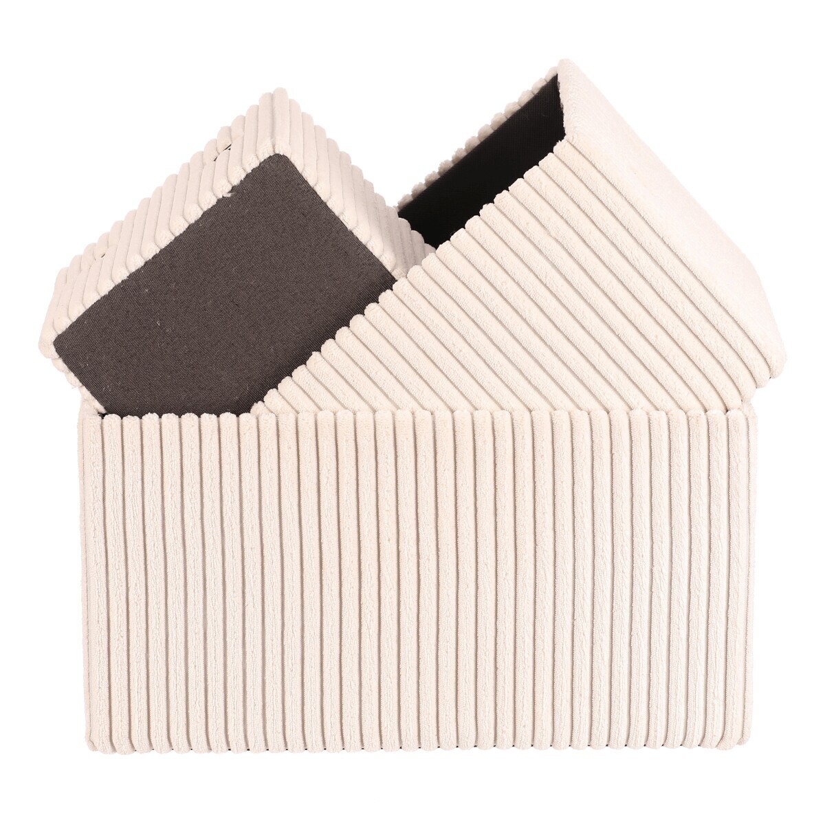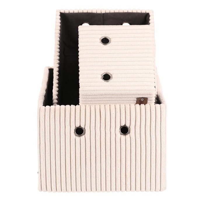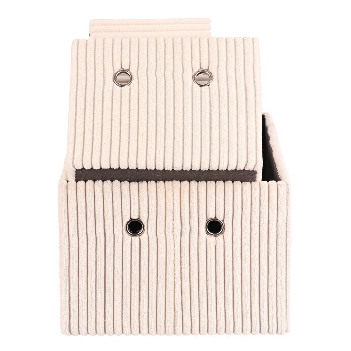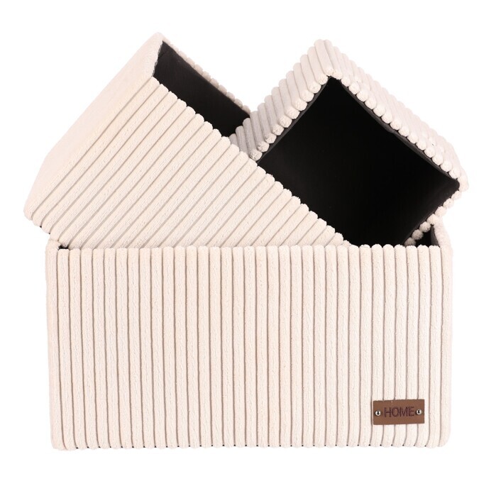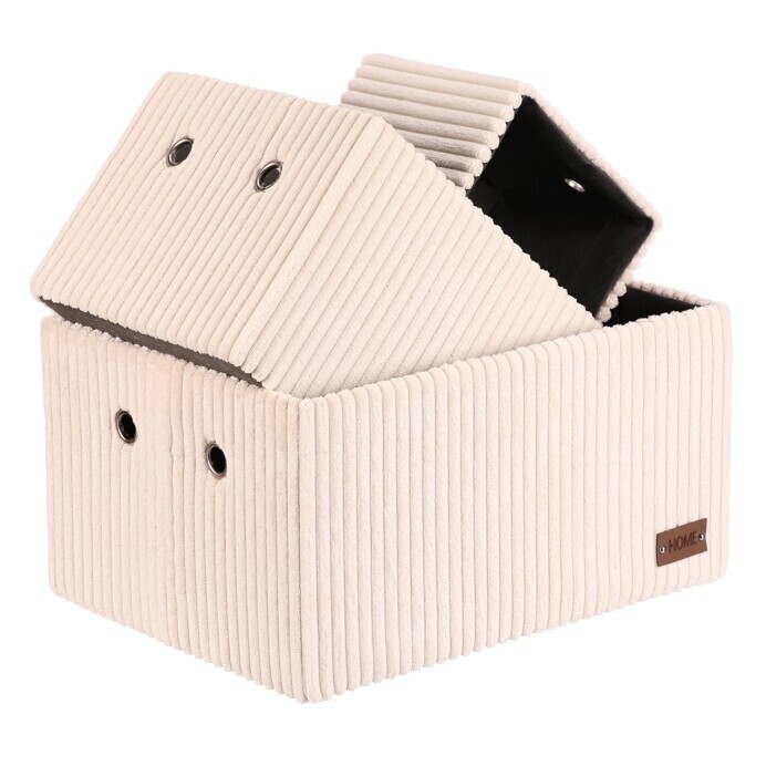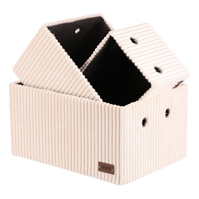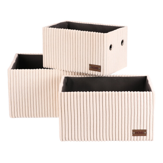Sada tří látkových regálových košů o třech různých velikostech s manšestrovým potahem přinese do vaší domácnosti pořádek i styl. Obdélníkový tvar perfektně sedne do polic, povrch je příjemný na dotek a elegantní vzhled skvěle ladí s moderním interiérem. Ideální pro uschování oblečení a nejrůznějších věcí a drobností, které chcete mít přehledně a úhledně uložené.