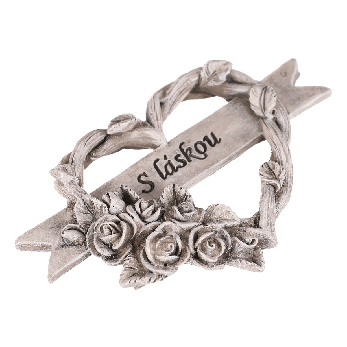 Decentní pietní dekorace v podobě proutí upleteného do tvaru srdce se stuhou a vše doplněné květy růží. Stuha je doplněna nápisem „S láskou“ pro umocnění symbolu úcty a vzpomínky. Šedé provedení a jemné detaily dodávají dekoraci vkusný a důstojný vzhled. Dekorace vyrobena z odolného polyresinu je vhodná pro venkovní pietní a vzpomínková místa.