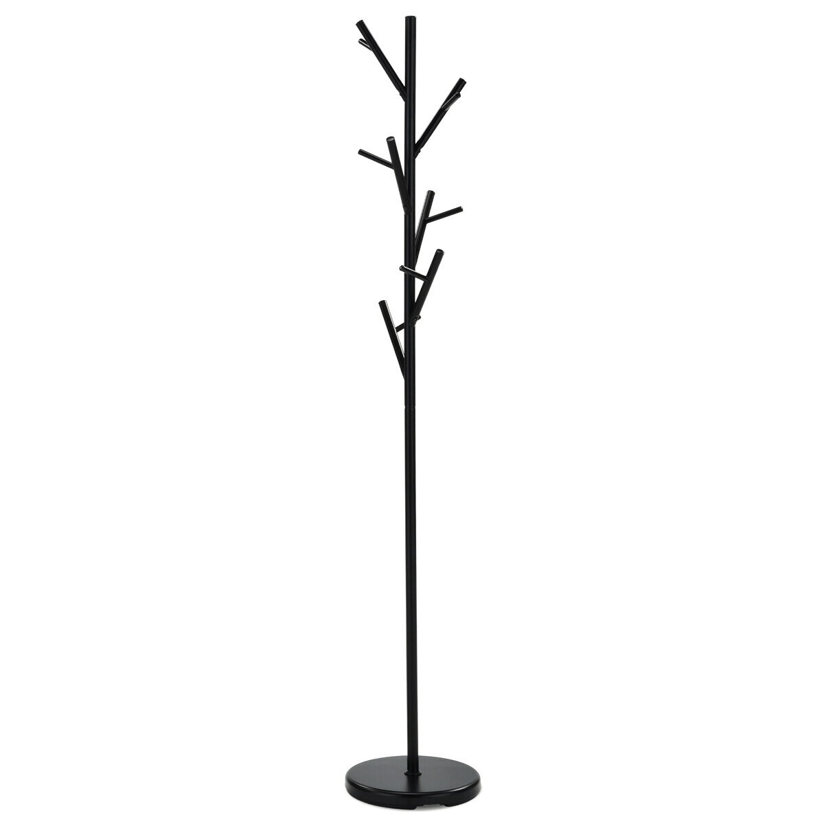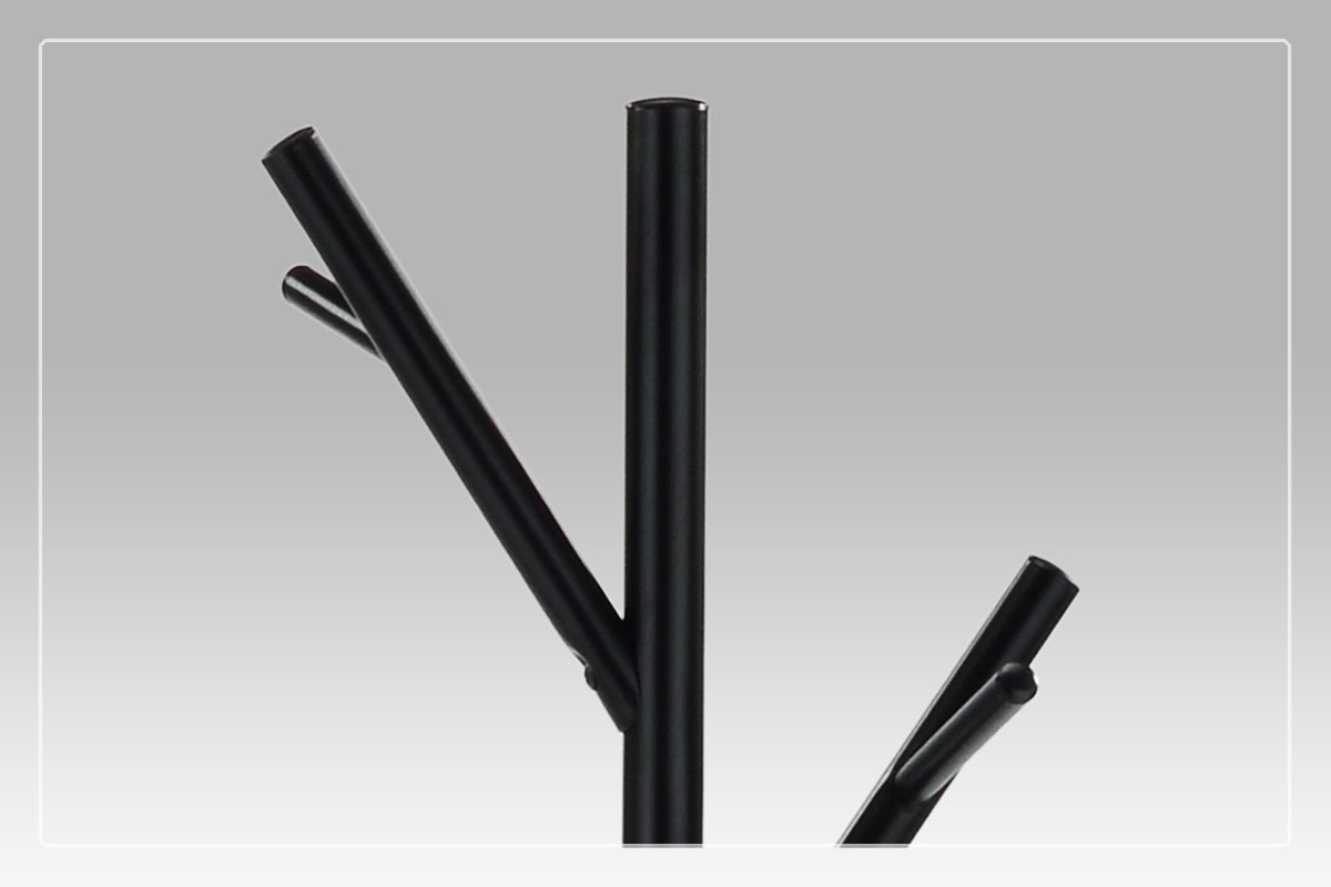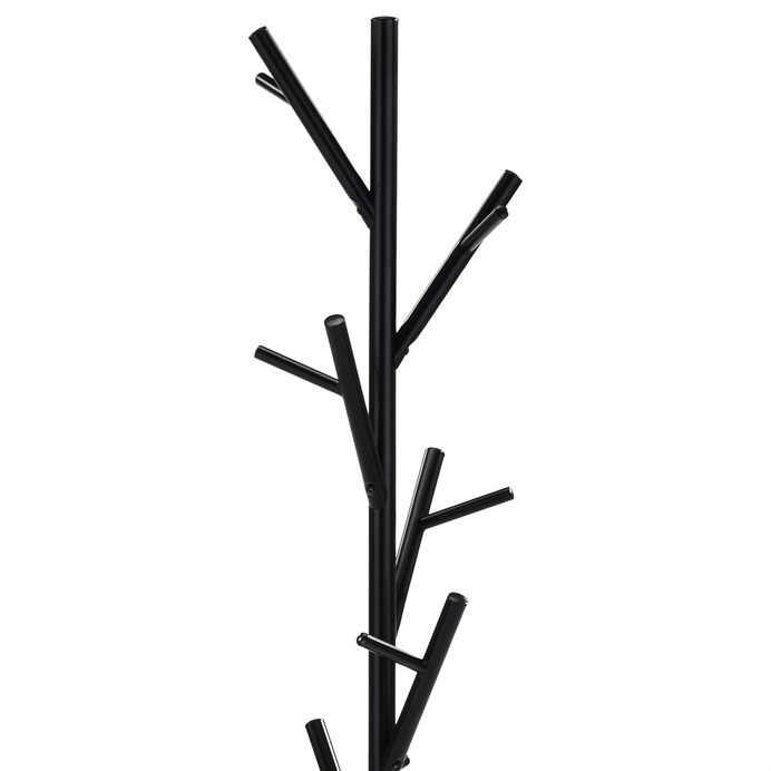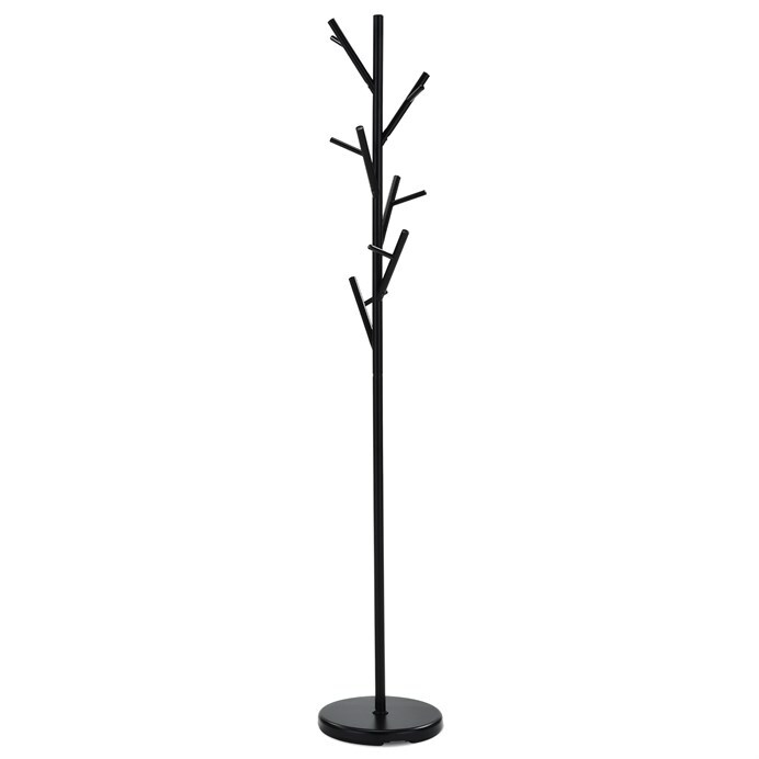 Stojanový věšák v černém matném provedení je vyroben z pevného kovu, který zajišťuje stabilitu a dlouhou životnost. Výška 170 cm nabízí dostatek prostoru pro zavěšení kabátů, bund i doplňků na několika větvích, které jsou rozmístěny asymetricky pro lepší přístupnost. Kulatá základna pevně drží věšák na místě a umožňuje nosnost až 10 kg. Jednoduchý a moderní design se hodí do různých interiérů, od kanceláří po domácnosti.
