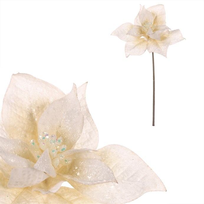 Umělá vánoční růže v bílé barvě je vyrobena z textilu s jemným třpytivým efektem, který dodává květu slavnostní vzhled. Detailní zpracování okvětních lístků věrně napodobuje přirozenou strukturu a tvar květu. Díky dlouhému stonku je vhodná pro aranžmá do vánočních dekorací, věnců nebo jako samostatný dekorativní prvek. Třpytky na povrchu přinášejí jemný vizuální efekt, který podtrhuje sváteční atmosféru.