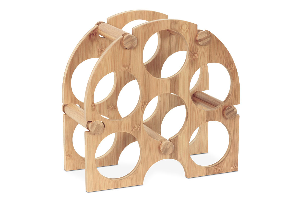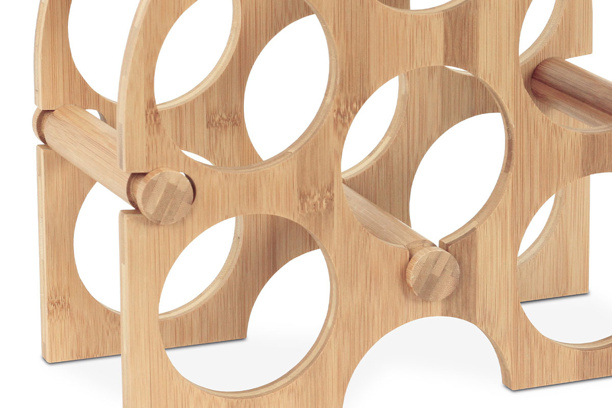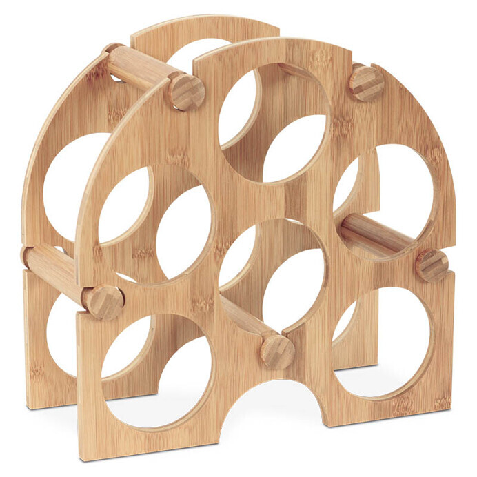 Stojan na víno z přírodního bambusu nabízí praktické a estetické řešení pro uložení lahví. Jeho otevřený design s kruhovými otvory umožňuje bezpečné a stabilní uložení až šesti lahví. Bambusové provedení přináší přírodní vzhled a zároveň materiál, který se snadno udržuje. Kompaktní rozměry stojanu umožňují jeho umístění na kuchyňskou linku, barový pult nebo jídelní stůl, kde vynikne svým jednoduchým a funkčním designem.