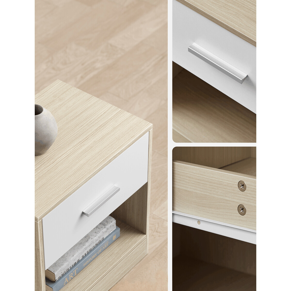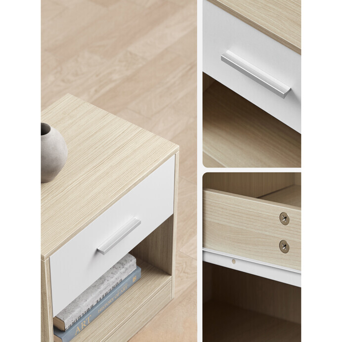 Sada dvou nočních stolků v přírodní béžové barvě s bílými čely zásuvek nabízí praktické řešení pro uspořádání prostoru vedle postele. Vyrobeny jsou z MDF s matnou povrchovou úpravou v dekoru běleného dubu, která zajišťuje snadnou údržbu a odolnost proti běžnému opotřebení. Každý stolek disponuje jednou zásuvkou s jednoduchou úchytkou a otevřeným úložným prostorem pod ní, ideálním pro uložení knih nebo drobných předmětů. Kompaktní rozměry 39 × 27,6 × 41 cm umožňují snadné umístění i do menších prostor. Stabilní provedení MDF materiálu zaručuje dlouhou životnost a pevnost stolku.