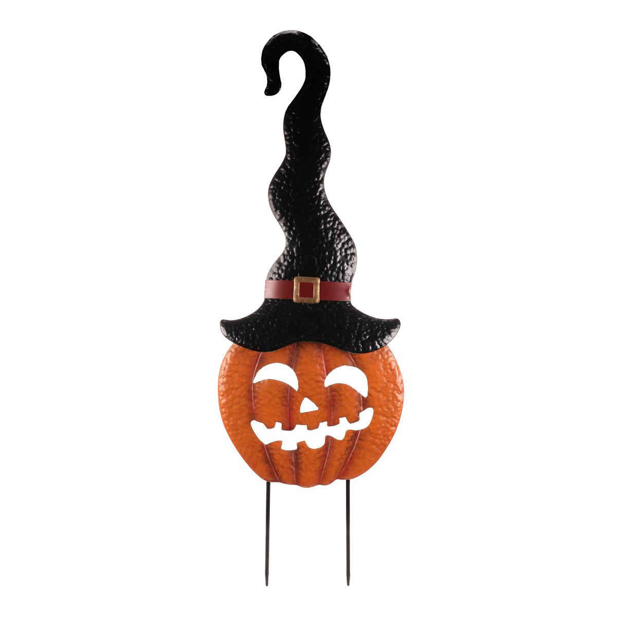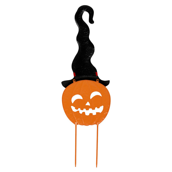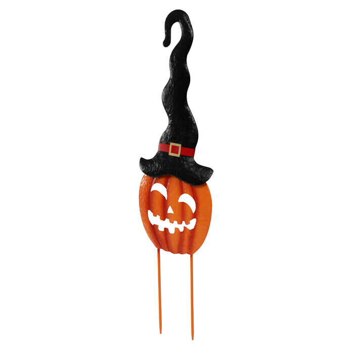 Strašidelná oranžová dýně s černým kloboukem jako kovový zápich dodá vaší podzimní výzdobě ten správný halloweenský nádech. Skvělá volba pro temné a sychravé večery, která vnese do zahrady nebo před vchod domu trochu tajemna a lehce děsivou atmosféru.