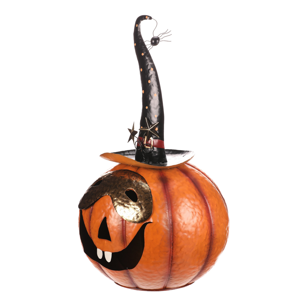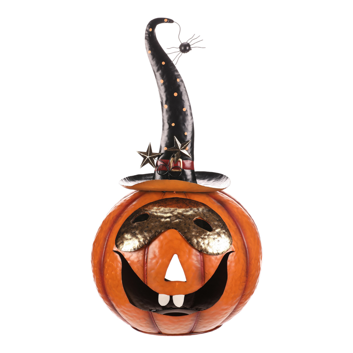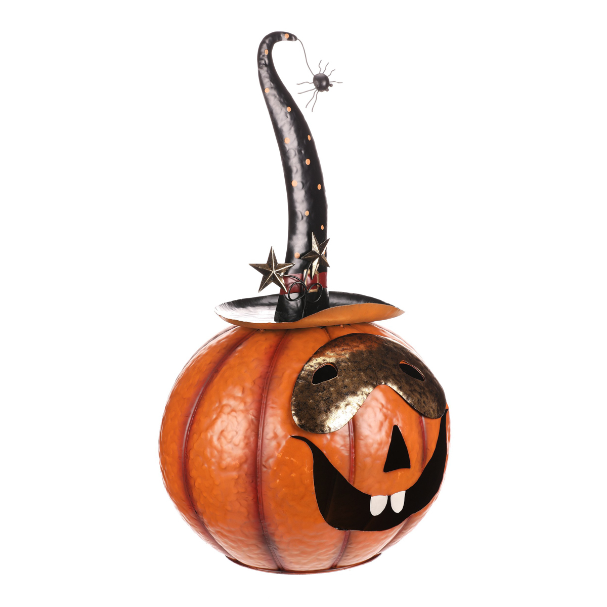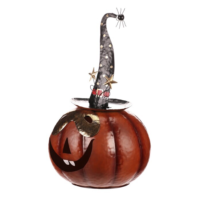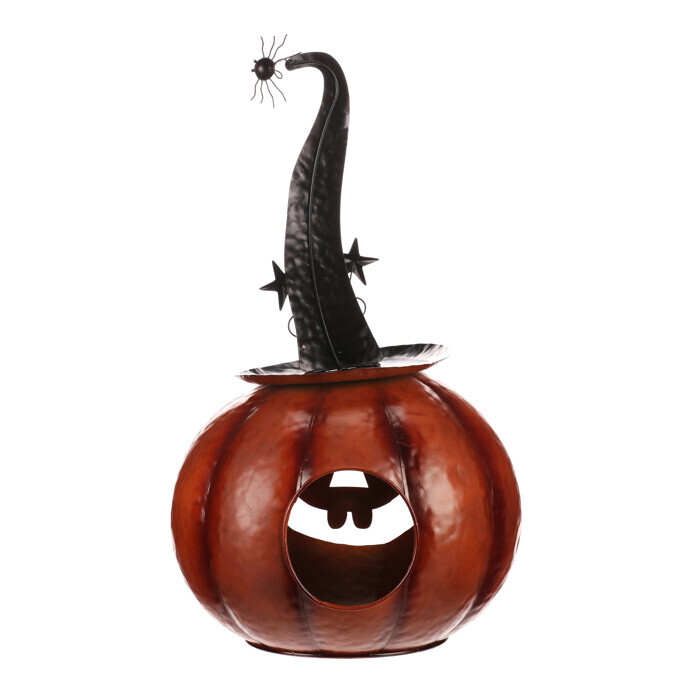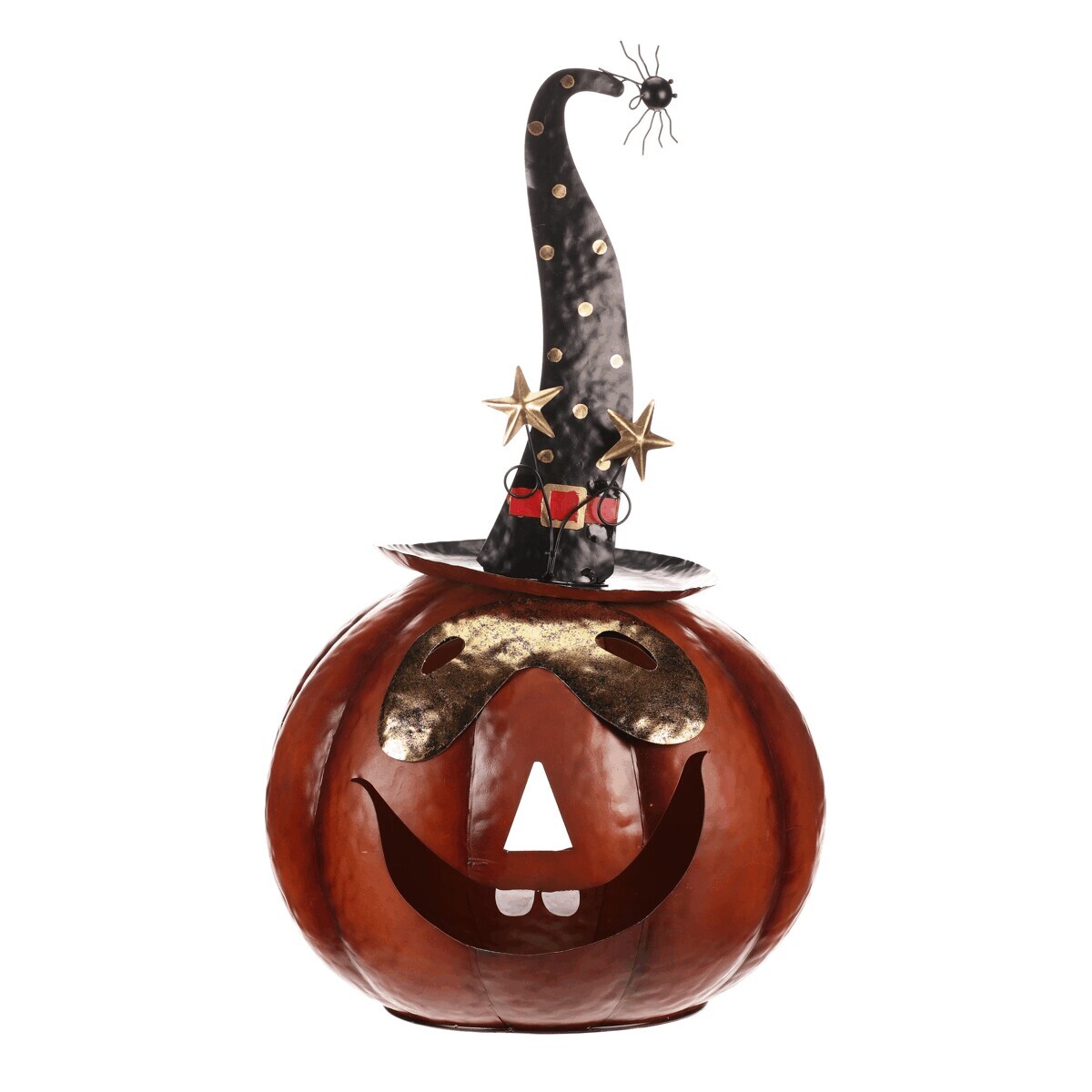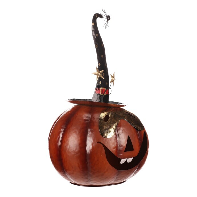 Oranžová kovová dýně se špičatým kloboukem sice vypadá strašidelně, ale její veselý výraz napoví, že to s tou hrůzou nebude tak zlé. Ideální dekorace na Halloween i podzimní večery, která potěší každého, kdo má rád trochu tajemna s úsměvem.