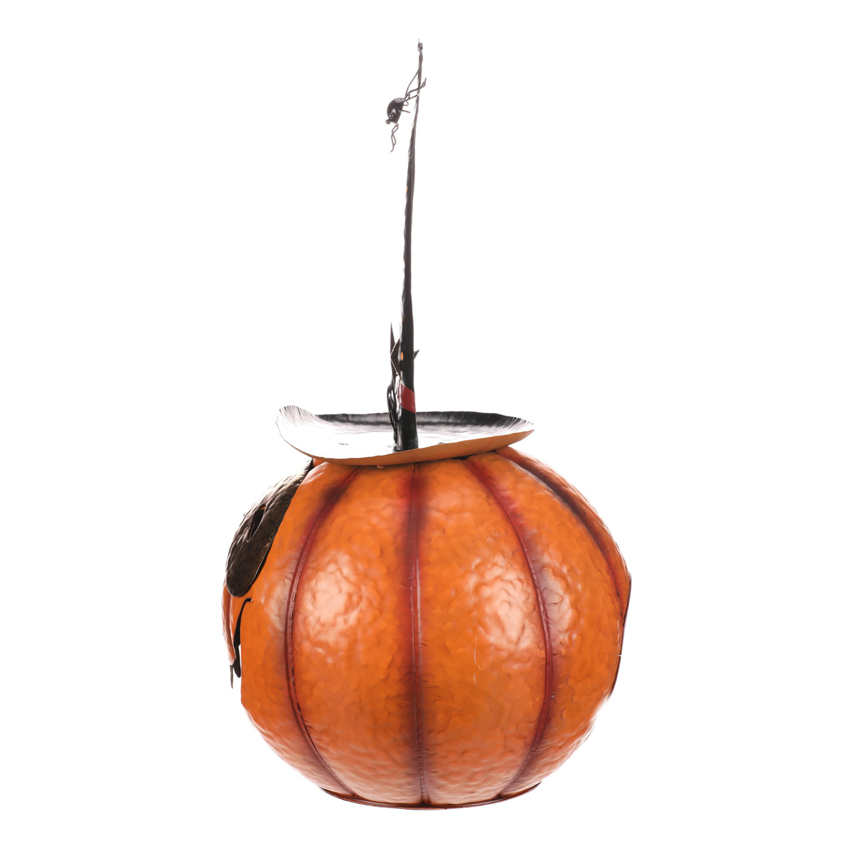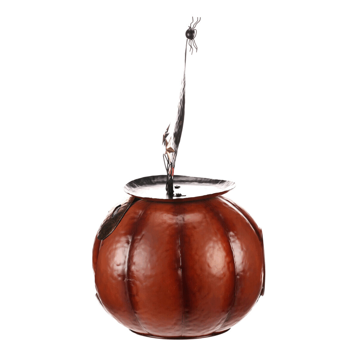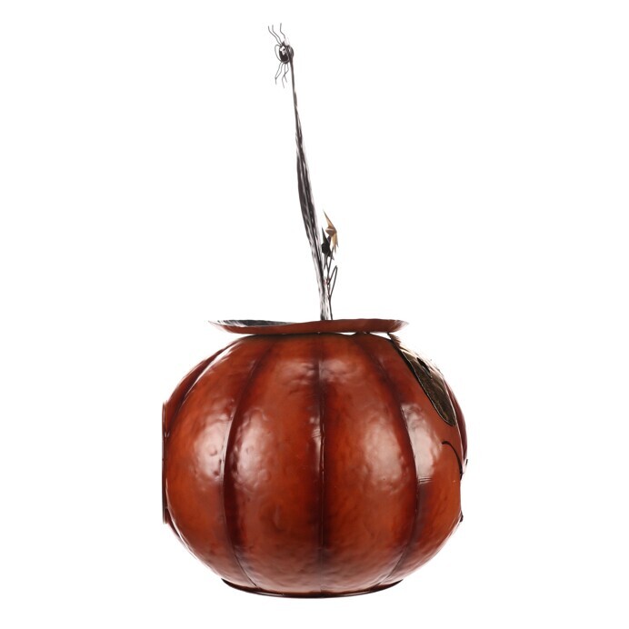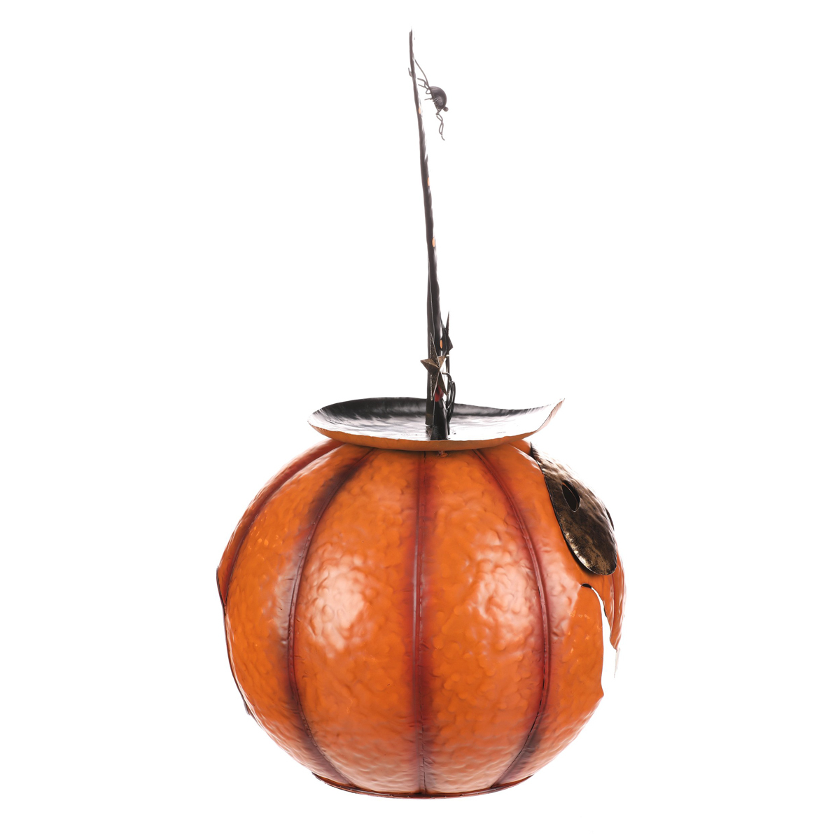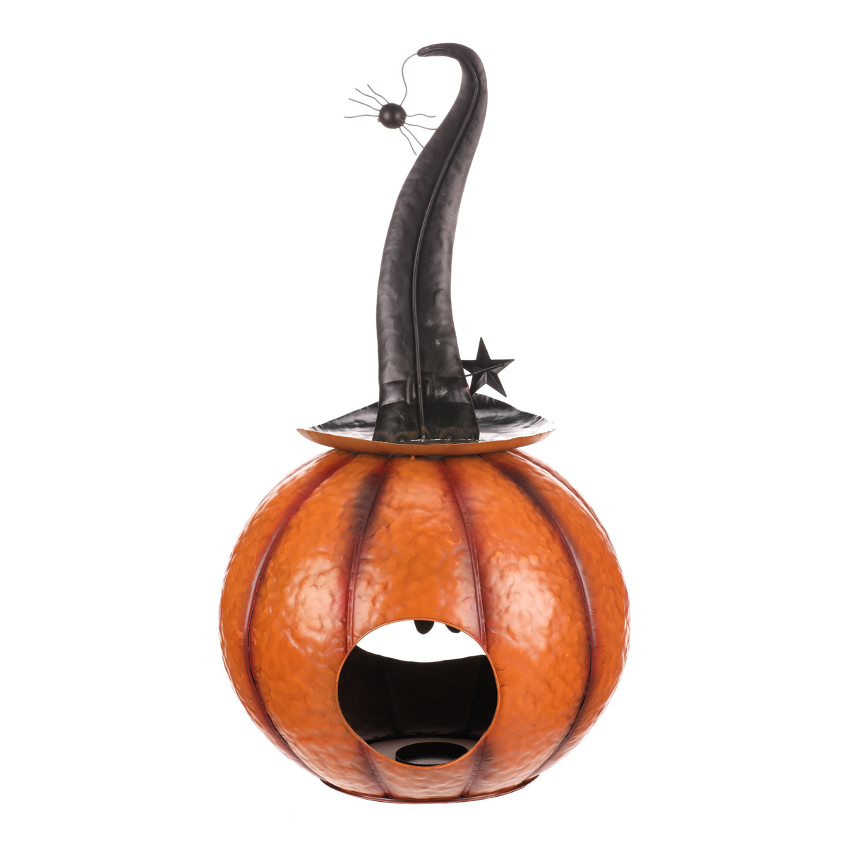 Oranžová kovová dýně se špičatým kloboukem sice vypadá strašidelně, ale její veselý výraz napoví, že to s tou hrůzou nebude tak zlé. Ideální dekorace na Halloween i podzimní večery, která potěší každého, kdo má rád trochu tajemna s úsměvem.