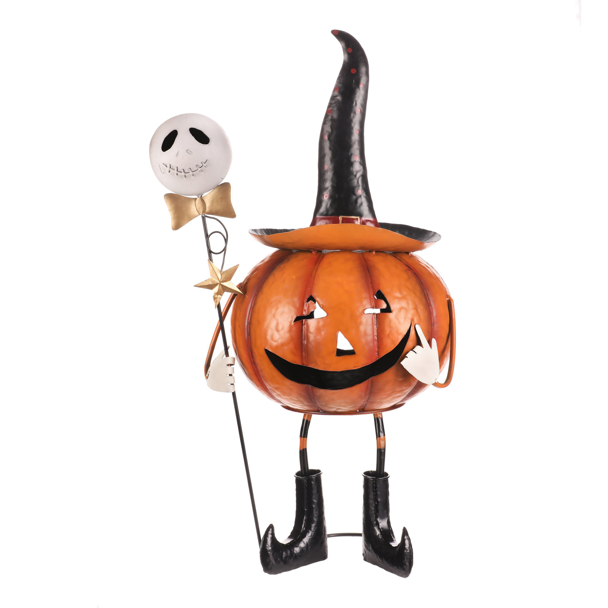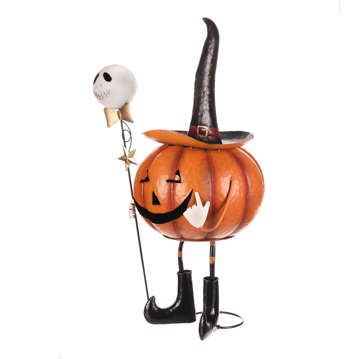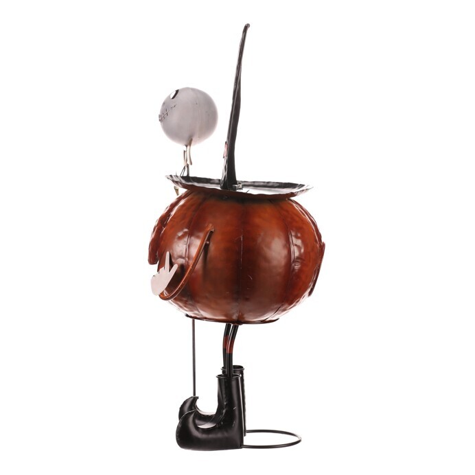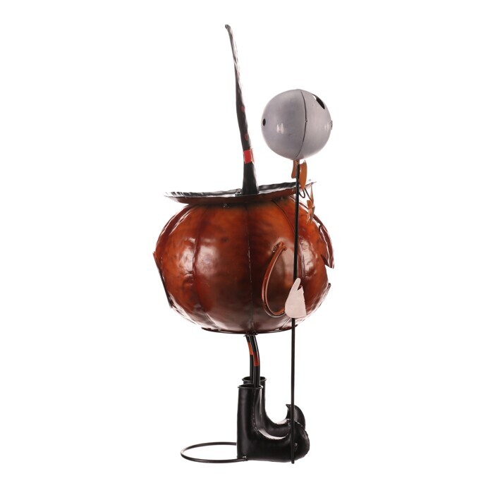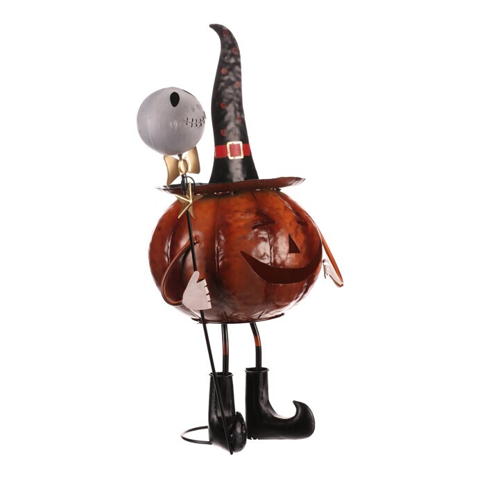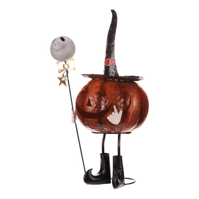 Oranžová kovová dýně s kloboukem a hůlkou zakončenou bubákem, sice vypadá strašidelně, ale její veselý výraz napoví, že to s tou hrůzou nebude tak zlé. Ideální dekorace na Halloween i podzimní večery, která potěší každého, kdo má rád trochu tajemna s úsměvem.